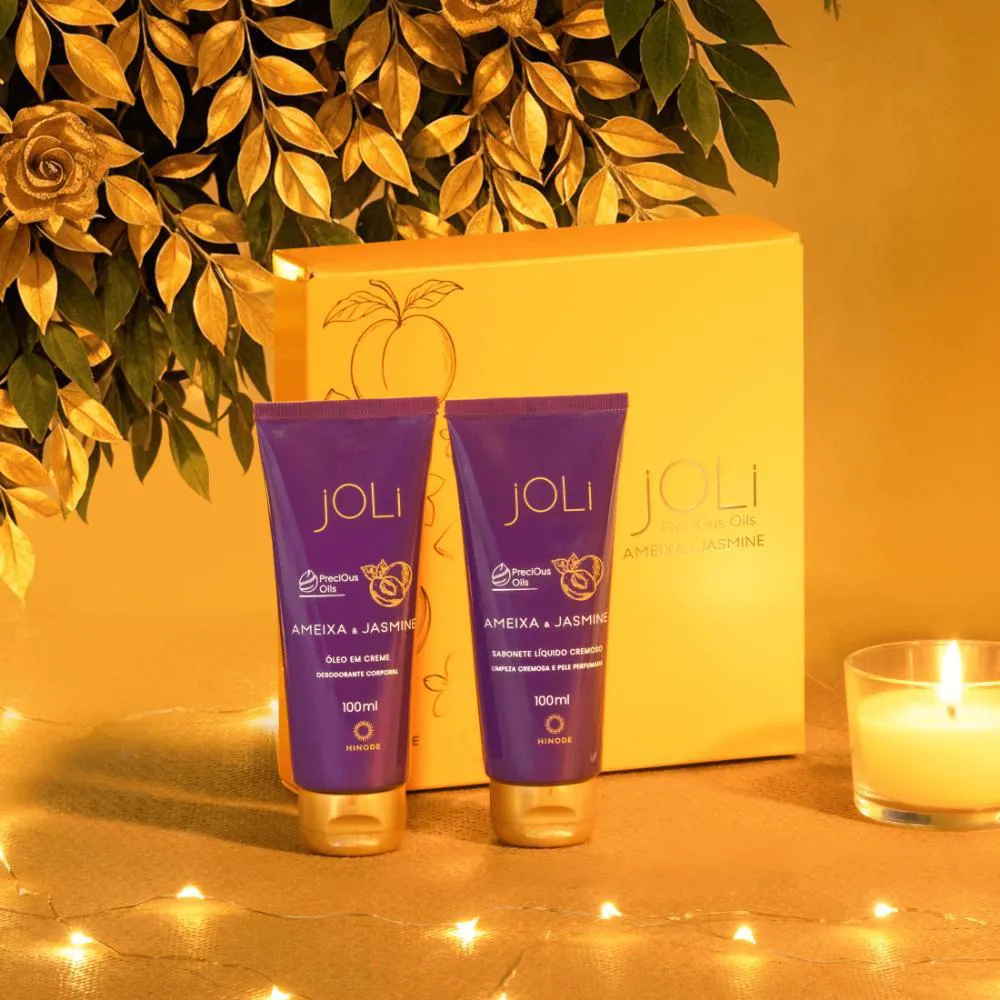 Neste Natal, cada presente Hinode é um gesto que ilumina, despertando memórias, emoções e a essência de quem o recebe.O Kit Joli Ameixa Hinode chega em uma edição especial para transformar o ritual de autocuidado em um momento de puro prazer e sofisticação. Inspirada nos óleos preciosos, a linha Joli proporciona uma pele intensamente hidratada, com toque macio e fragrância encantadora.O novo Sabonete Líquido Joli apresenta textura cremosa e suave, que limpa delicadamente enquanto mantém a pele macia, hidratada e perfumada. Já o Óleo em Creme Desodorante Corporal oferece nutrição intensa e toque aveludado, revelando o brilho natural e saudável da pele.A combinação envolvente do óleo de ameixa, conhecido por seu poder nutritivo, com a sensualidade do jasmim, cria uma experiência sensorial única — perfeita para quem valoriza o autocuidado com elegância.O KIT CONTÉM