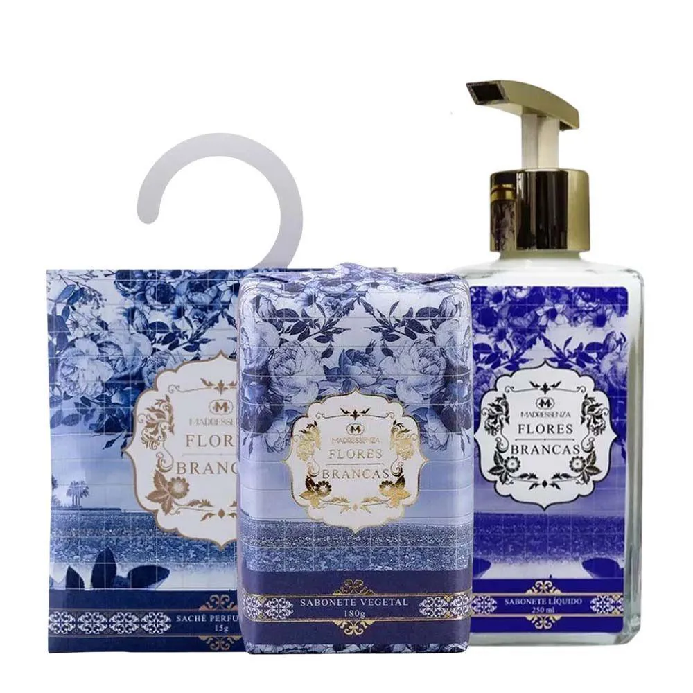 Kit Sabonete Vegetal + Sachê Perfumado + Sabonete Líquido Flores Brancas Madressenza 250ml