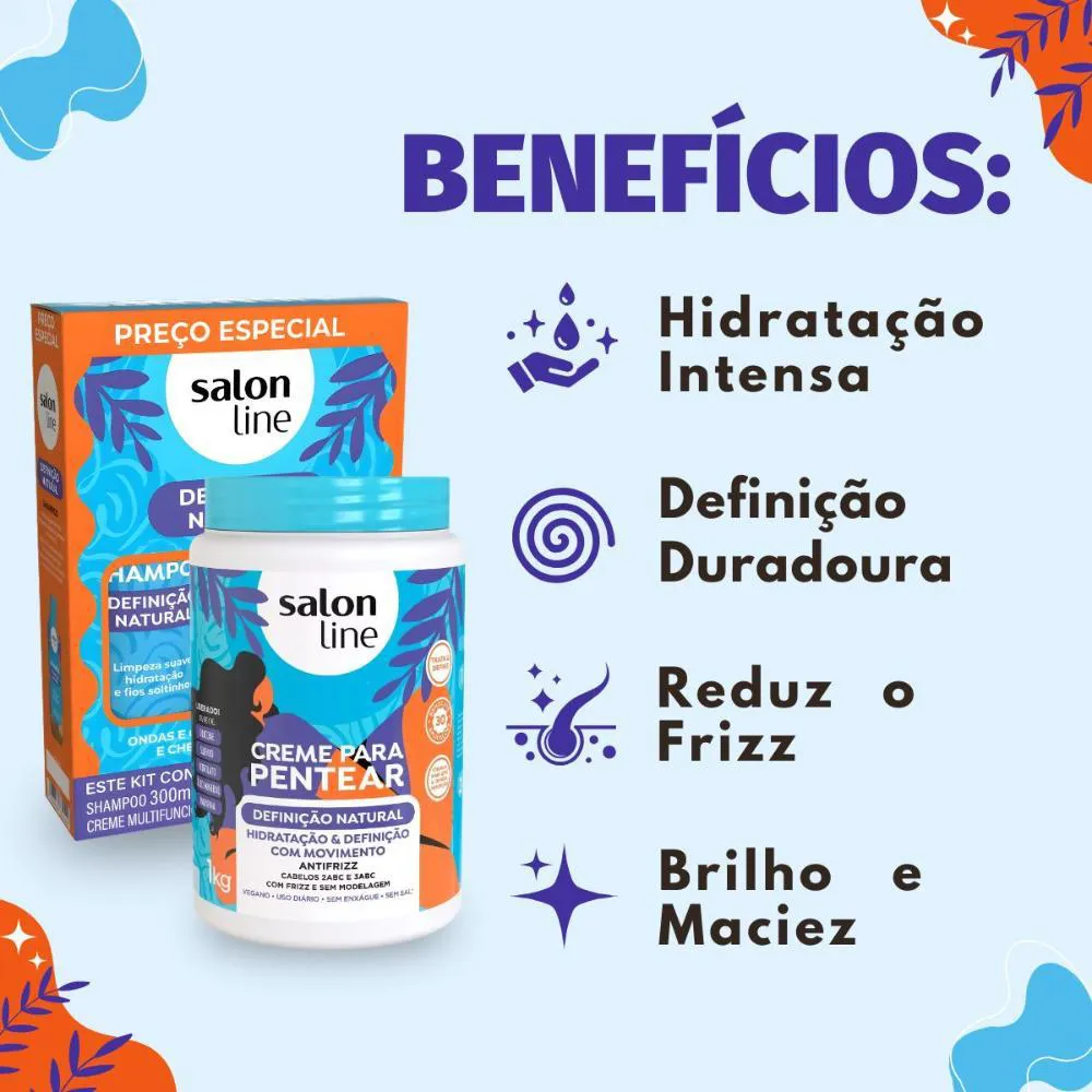 O Kit Salon Line Definição Natural é um conjunto completo de produtos capilares composto por shampoo, creme multifuncional e creme para pentear, desenvolvido especificamente para cuidar, hidratar e definir cachos e ondas naturais. Seu objetivo principal é proporcionar uma rotina de cuidados capilares que realça a beleza e textura natural dos cabelos, oferecendo hidratação, nutrição e controle de frizz com praticidade.