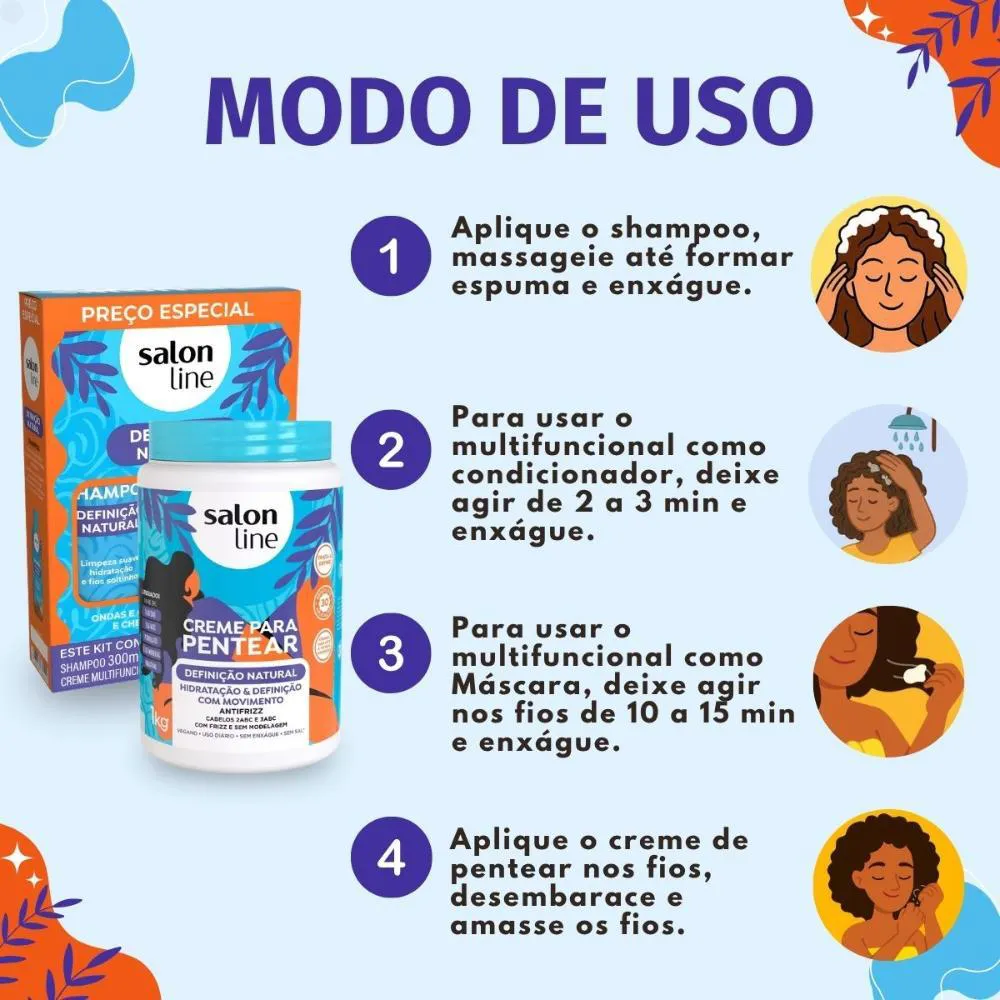 Como usar o Kit Salon Line Definição Natural: Shampoo, Creme Multifuncional 300Ml E Creme Para Pentear 1Kg?