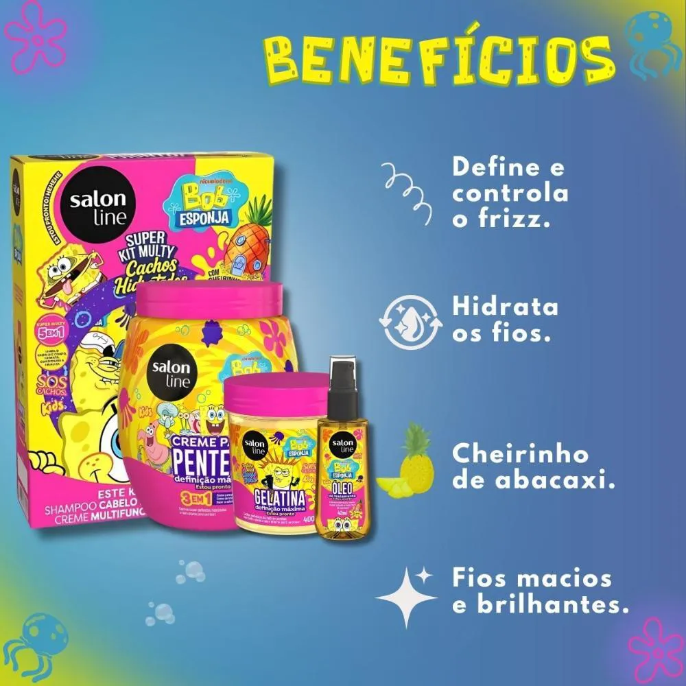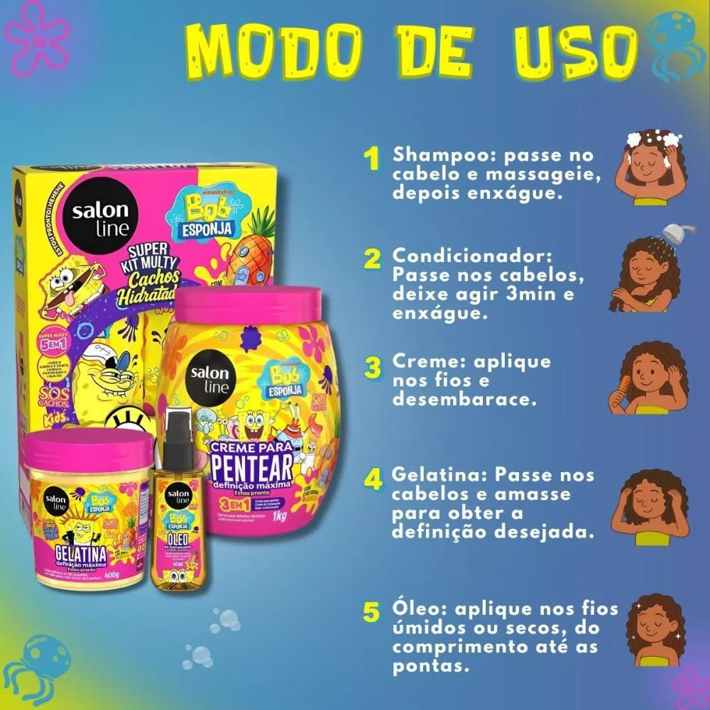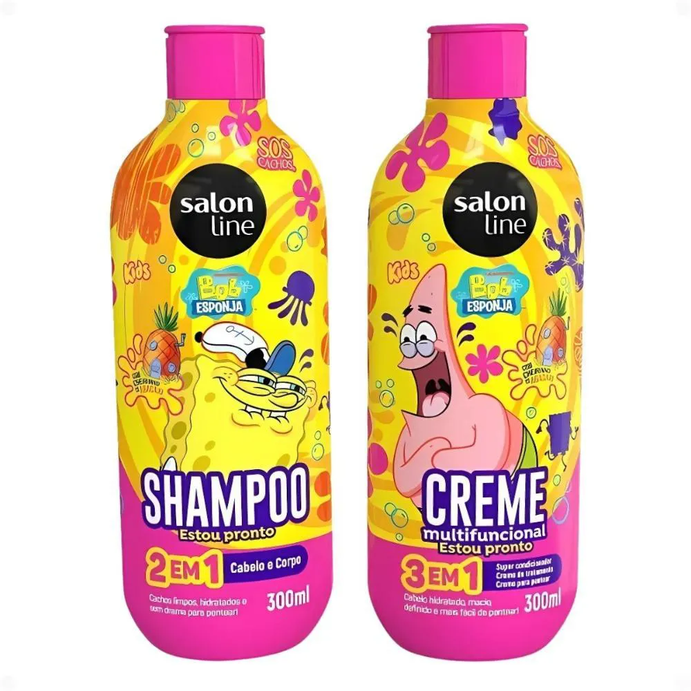 O Kit Salon Line Kids Bob Esponja Sos Cachos Completo é um conjunto de produtos capilares desenvolvido especialmente para cuidar dos cabelos cacheados infantis, composto por shampoo, creme multifuncional, creme para pentear, gelatina capilar e óleo de tratamento, todos com temática do personagem Bob Esponja. Serve para proporcionar hidratação, definição e desembaraço dos cachos infantis, transformando o momento do cuidado capilar em uma experiência divertida e lúdica para as crianças.
