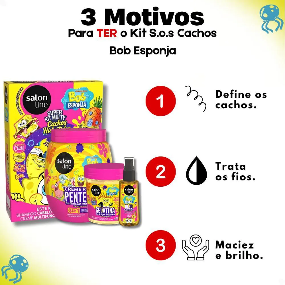 O Kit Salon Line Kids Bob Esponja Sos Cachos Completo + Mimo é a solução perfeita para pais que buscam um cuidado eficaz e divertido para os cabelos cacheados de seus filhos. Desenvolvido especialmente para crianças, este kit completo oferece uma rotina de cuidados que transforma o momento do banho em uma aventura submarina com o personagem mais amado do fundo do mar, o Bob Esponja.Este conjunto foi formulado para atender às necessidades dos cabelos cacheados infantis, proporcionando hidratação, definição e desembaraço, enquanto garante um cuidado suave e seguro. Com o Kit Salon Line Kids Bob Esponja, os cachinhos dos pequenos ficarão saudáveis, macios e cheios de vida, com um toque de diversão.
