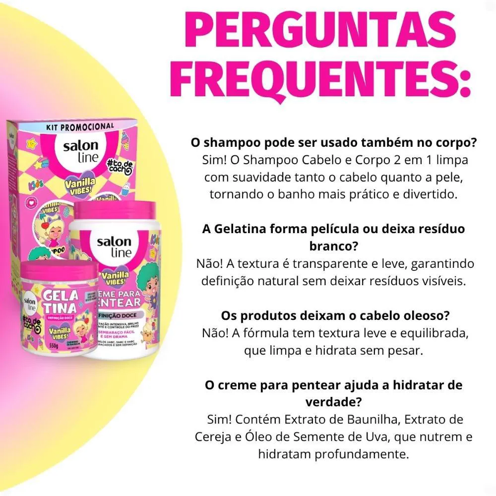 O Kit Contém: - 1 shampoo cabelo E corpo Vanilla Vibes! 300ml - 1 Creme Multifuncional Vanilla Vibes! 300ml - 1 Creme Para Pentear Vanilla Vibes! 1kg - 1 Gelatina Capilar Vanilla Vibes! 550g - 1 Mimo Ativador de Cachos Teen Salon Line 300ml