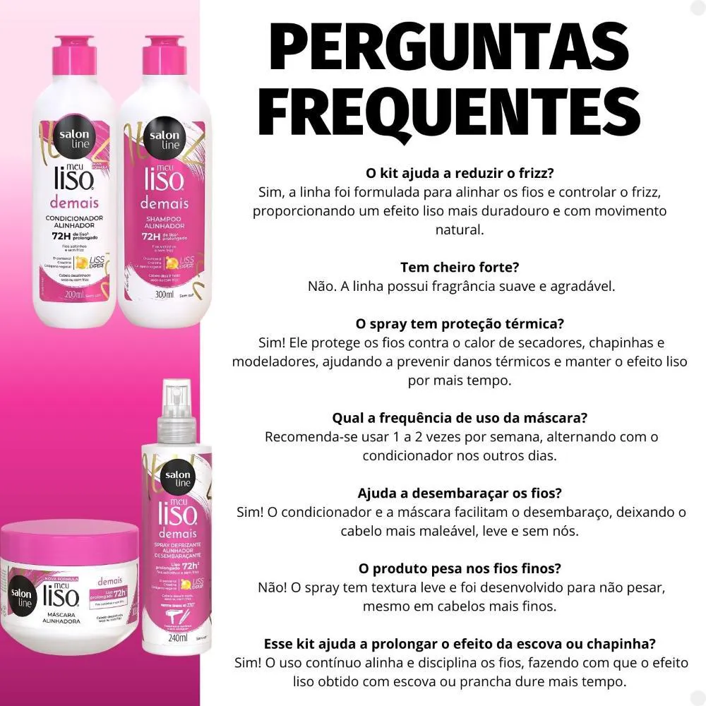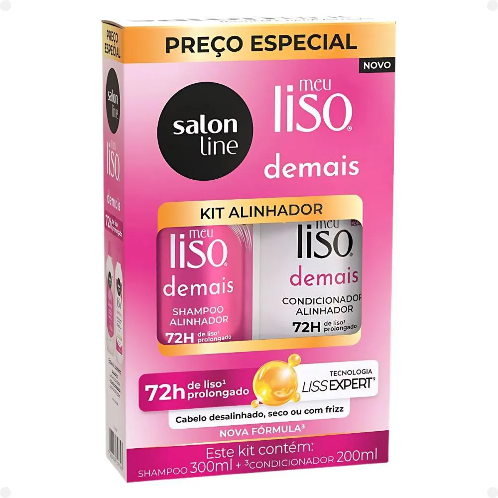 Contém: - 01 shampoo Salon Line Meu Liso Demais Alinhador 300ml. - 01 condicionador Salon Line Meu Liso Demais Alinhador 200ml. - 01 Creme de Tratamento Salon Line Meu Liso Demais Alinhador 300g. - 01 Spray Defrizante Desembaraçante Salon Line Meu Liso Demais Alinhador 240ml. . Kit Alinhador O Kit Salon Line Meu Liso Demais Alinhador é a escolha perfeita para quem deseja um cabelo liso, hidratado e sem frizz. Composto por Shampoo 300ml, Condicionador 200ml, Creme de Tratamento 300g e Spray Defrizante Desembaraçante 240ml, esse kit proporciona uma rotina completa de cuidados para cabelos disciplinados e alinhados. O shampoo limpa suavemente, controla o frizz e prepara os fios para o restante do tratamento. O condicionador hidrata, sela as cutículas e mantém o cabelo mais suave e com brilho. O creme de tratamento oferece uma hidratação profunda, deixando os fios alinhados e sem frizz. O spray defrizante desembaraçante protege os fios do calor, desembaraça e controla o frizz, mantendo o cabelo alinhado durante o uso de secadores e chapinhas. Ideal para cabelos lisos, alisados ou em processo de alisamento, o kit garante fios mais hidratados, disciplinados e com aquele efeito liso natural duradouro. . Modo de Uso Shampoo: Aplique o shampoo sobre o cabelo molhado e massageie até formar espuma. Enxágue bem. Caso necessário, repita a aplicação. Condicionador: Com os cabelos limpos e úmidos, aplique o condicionador mecha a mecha, massageando do comprimento até as pontas. Enxágue bem. Creme de Tratamento: Com o cabelo limpo e úmido, aplique o produto mecha por mecha. Deixe agir por 5 minutos e enxágue. Spray Defrizante: AGITE ANTES DE USAR. Aplique em todo o comprimento do cabelo úmido ou seco, mecha a mecha. Deixe secar naturalmente ou inicie o processo de escovar com secador, e se desejar, finalize com a prancha. . Perguntas Frequentes Posso usar o Creme de Tratamento diariamente? O Creme de Tratamento é mais indicado para uso semanal, pois oferece uma hidratação intensa. No entanto, se o seu cabelo estiver muito seco ou danificado, pode ser usado com mais frequência. O Kit Meu Liso Demais Alinhador pode ser usado em cabelos com progressiva? Sim! O kit é ideal para cabelos com progressiva, pois ajuda a manter o efeito liso por mais tempo, controla o frizz e mantém os fios hidratados e disciplinados. O Creme de Tratamento pode ser usado antes de aplicar o shampoo? Não, o Creme de Tratamento deve ser aplicado após o shampoo e o condicionador, com os fios limpos e úmidos, para proporcionar hidratação intensa e alinhamento. O Spray Defrizante pode ser usado sem enxágue? Sim, o Spray Defrizante Desembaraçanteé um produto de uso sem enxágue. Basta aplicá-lo nos fios antes de usar o secador, chapinha ou para controlar o frizz ao longo do dia. . Código de Registro Sanitário (ANVISA) Shampoo: 25351.697238/2019-11 Condicionador: 25351.697239/2019-58 Creme de Tratamento: 25351.219882/2022-40 Spray Defrizante: 25351.652464/2022-61