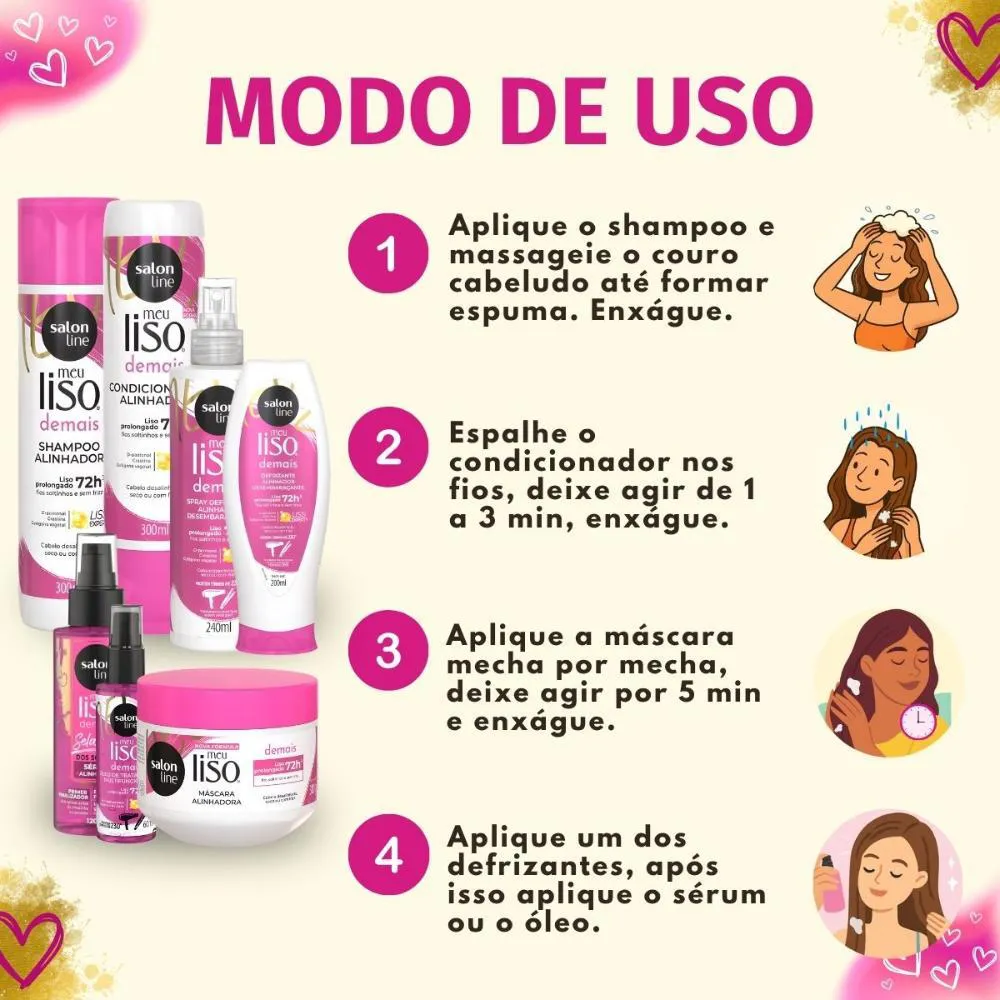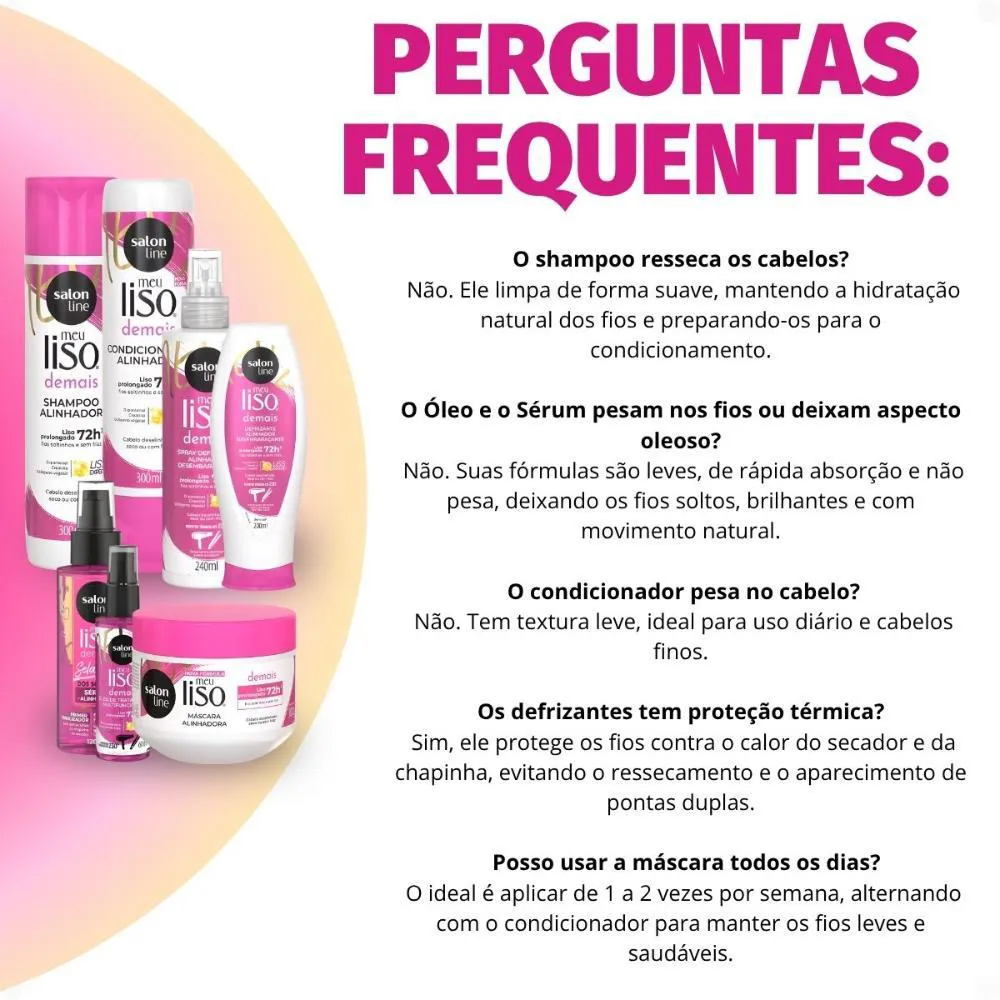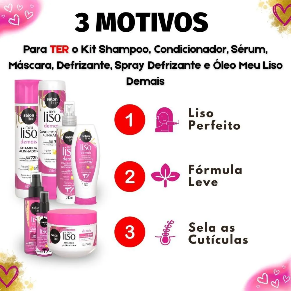 O Kit Salon Line Meu Liso Demais Completo é um conjunto de produtos capilares desenvolvido para alisar, tratar e finalizar os cabelos, oferecendo um resultado profissional de alisamento em casa.