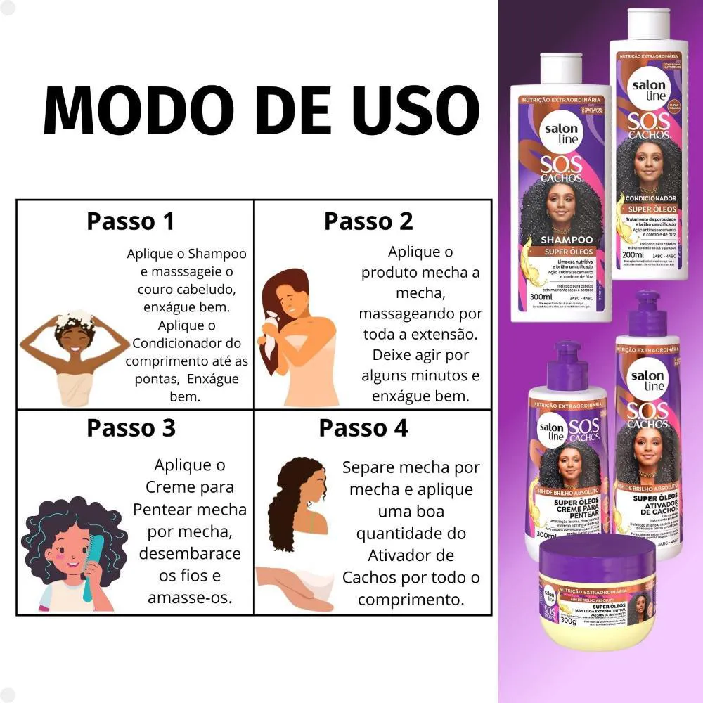 Como usar o Kit Salon Line Sos Cachos Super Óleos: Shampoo E Condicionador + Creme Para Pentear, Ativador De Cachos E Máscara?