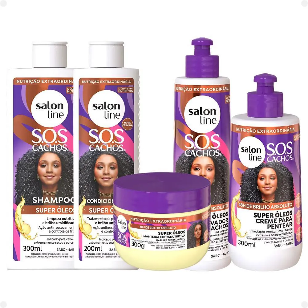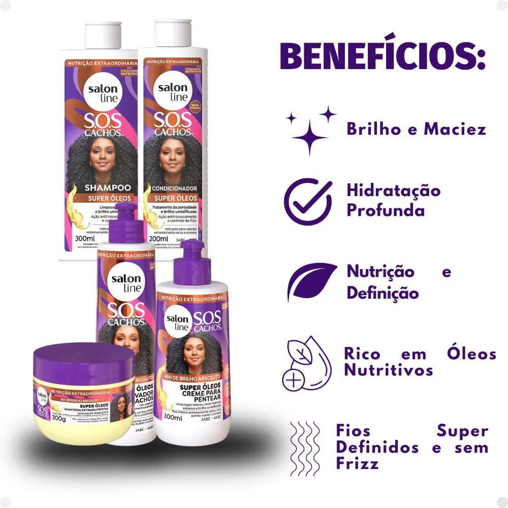 O Kit Salon Line SOS Cachos Super Óleos é uma solução completa para cuidados capilares específicos para cabelos cacheados, composto por cinco produtos que trabalham em conjunto para hidratar, definir e nutrir os cachos.