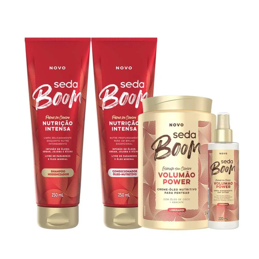 Kit Seda Boom: shampoo Nutrição 250ml + condicionador Nutrição 250ml + Creme para Pentear Volumão Power 1kg + Soro Hidratante Day After 200ml