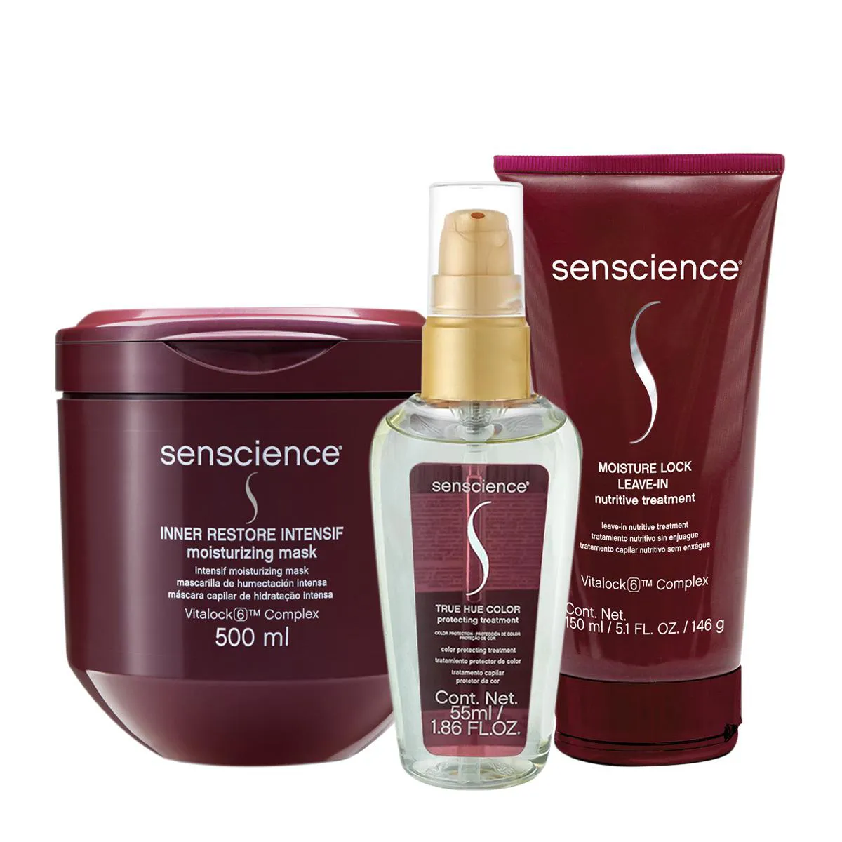 Este Kit ContémSenscience Inner Restore Intensif - Máscara Capilar 500ml: para fios grossos, com frizz intenso e danificados. Reconstrói e nutre o cabelo, devolvendo a saúde e o brilho natural. Senscience True Hue Color Protecting - Óleo Capilar 55ml: tratamento que ajuda a fixar, proteger e prolongar a vida da cor, prevenindo o desbotamento por ações dos raios solares. Repara profundamente a estrutura interna da fibra capilar, para fortalecer, melhorar a flexibilidade e evitar a quebra. Senscience Moisture Lock - Leave-in 150ml: tratamento capilar sem enxágue e com proteção térmica, restaura e mantém o equilíbrio ideal e a hidratação dos cabelos, proporcionando maciez, brilho e melhora da flexibilidade.