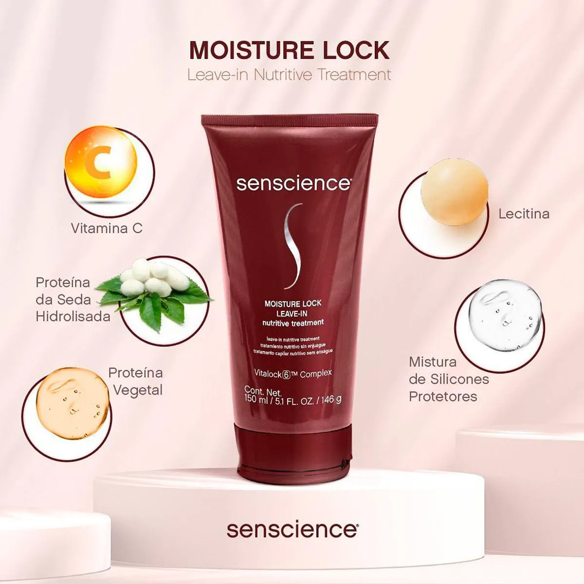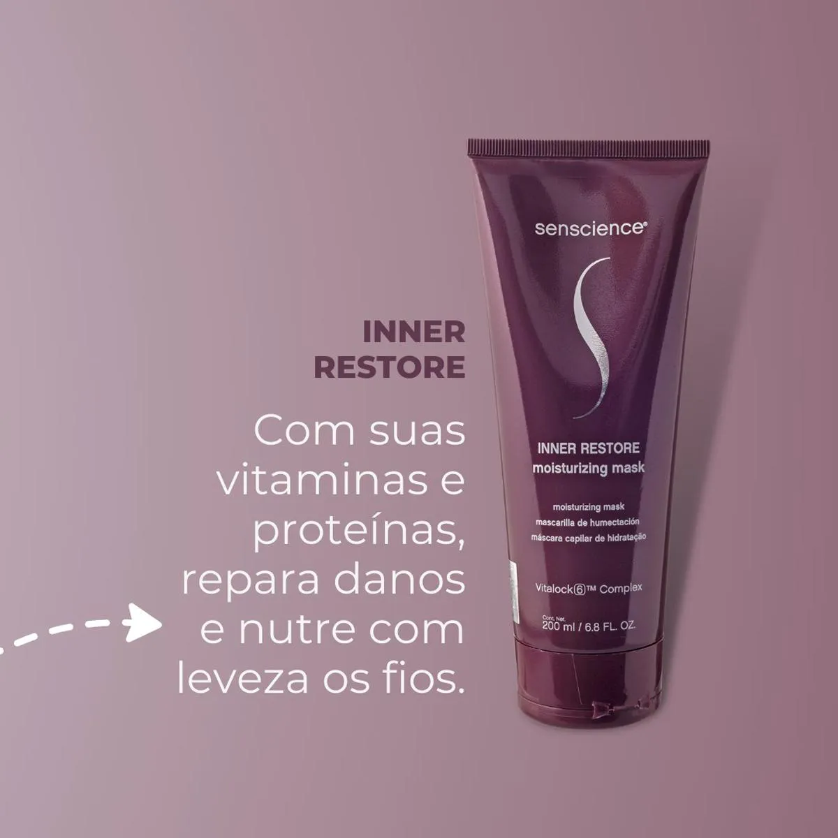 Este Kit ContémSenscience Inner Restore Moisturizing - Máscara Capilar 200g: para cabelos secos ou danificados. Restaura, fortalece e hidrata profundamente enquanto restabelece os níveis de água dentro do fio. Senscience True Hue Color Protecting - Óleo Capilar 55ml: tratamento que ajuda a fixar, proteger e prolongar a vida da cor, prevenindo o desbotamento por ações dos raios solares. Repara profundamente a estrutura interna da fibra capilar, para fortalecer, melhorar a flexibilidade e evitar a quebra. Senscience Moisture Lock - Leave-in 150ml: tratamento capilar sem enxágue e com proteção térmica, restaura e mantém o equilíbrio ideal e a hidratação dos cabelos, proporcionando maciez, brilho e melhora da flexibilidade.