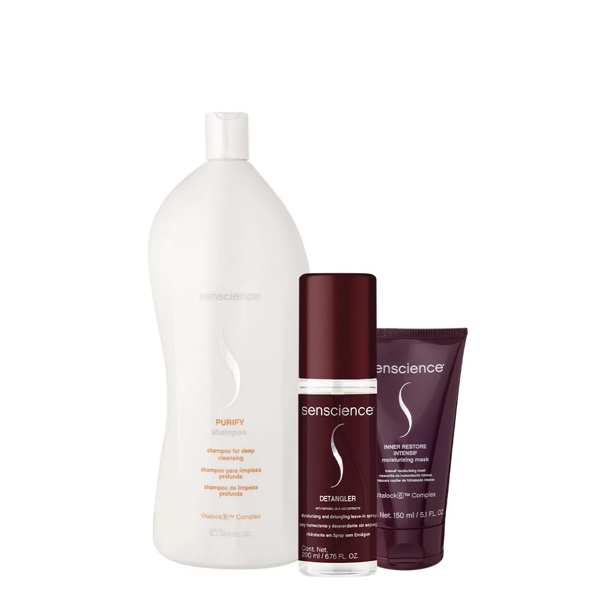 Este Kit ContémSenscience Purify - Shampoo Antirresíduo 1L: retira o acúmulo de resíduos naturais e de produtos modeladores, acoplados nas escamas do fio, sem danificar o cabelo. Age na fibra capilar, promovendo uma limpeza intensiva. Pode ser utilizado antes de processos químicos, colorações ou reconstruções, para que o produto passado consiga penetrar no fio com maior facilidade. Senscience Inner Restore Intensif - Máscara Capilar 150ml: para fios grossos, com frizz intenso e danificados. Reconstrói e nutre o cabelo, devolvendo a saúde e o brilho natural. Senscience Detangler Moisturizing - Leave-in Spray 200ml: para cabelos secos e danificados. Repara e nutre os fios, facilitando o desembaraço e reduzindo os danos mecânicos. Devolve a elasticidade, o brilho e a hidratação, sem pesar nos fios. Com proteção térmica.