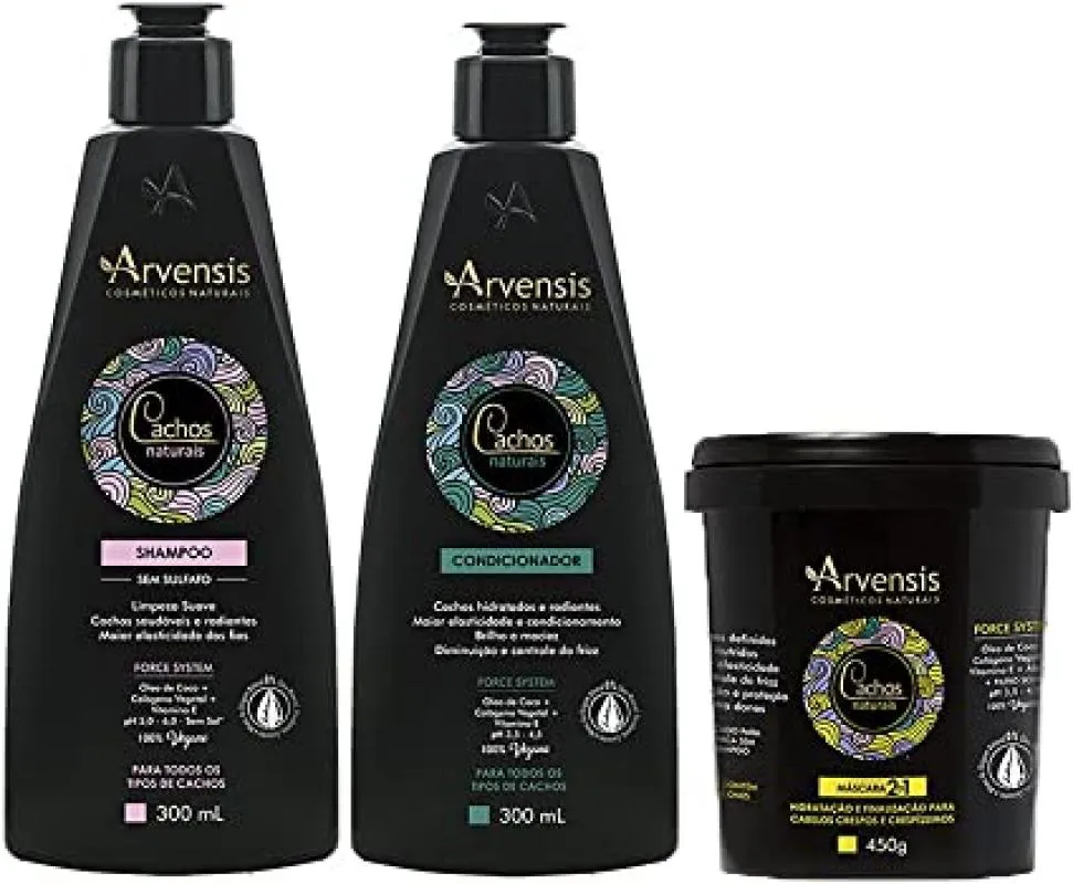 Kit completo para seu uso em casa com uma linha profissional. Kit completo com shampoo 300mL, condicionador 300mL e máscara 2x1 450g Arvensis, perfeita para você.