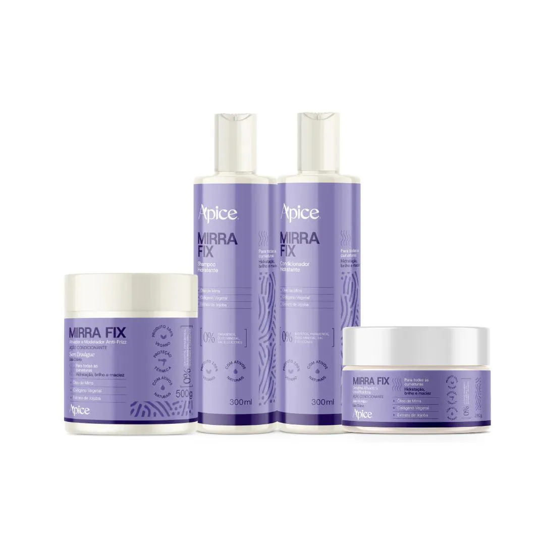 Kit Linha Mirra Fix contém: shampoo Hidratante 300ml, condicionador Hidrante 300 ml, Gelatina Ativadora 280g e Ativador e Modelador Anti-Frizz 500g.