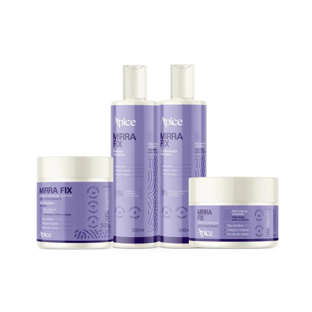 Kit Linha Mirra Fix contém: shampoo Hidratante 300ml, condicionador Hidrante 300 ml, máscara de Hidratante 300g e Ativador e Modelador Anti-Frizz 500g.
