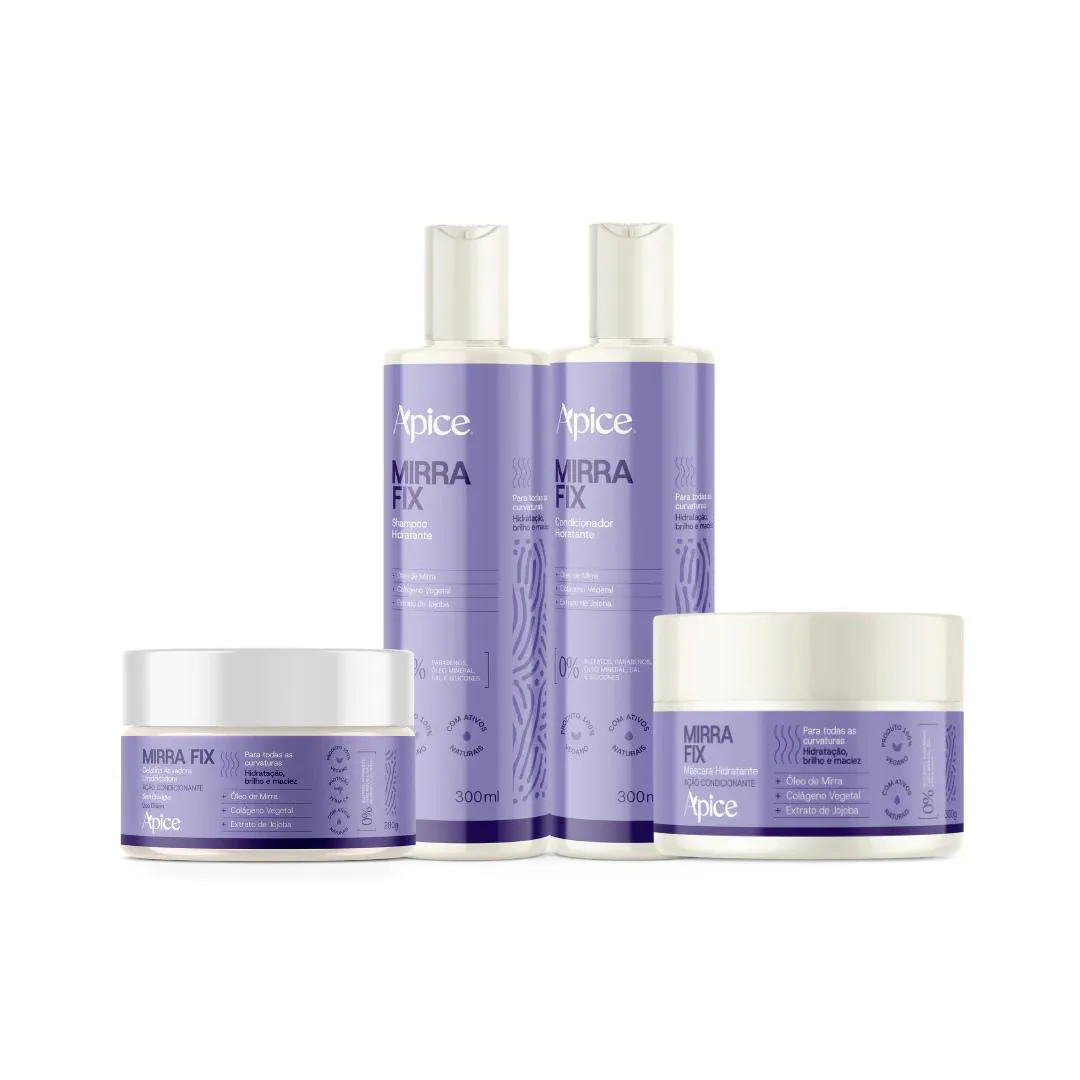 Kit Linha Mirra Fix contém: shampoo Hidratante 300ml, condicionador Hidrante 300 ml, máscara de Hidratante 300g e Gelatina Ativadora 280g