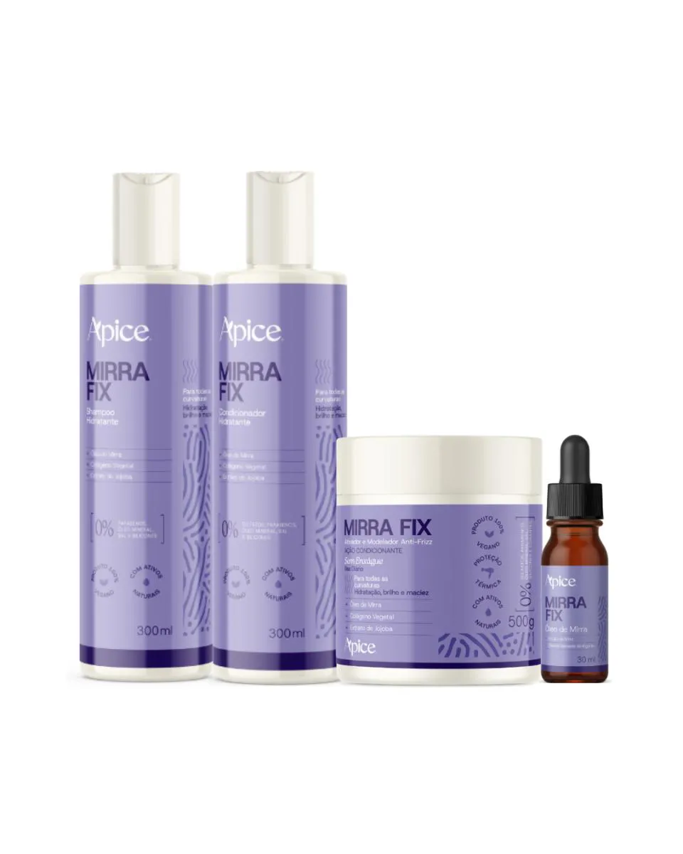 Transforme sua rotina capilar com o Kit Mirra Fix da Ápice, uma linha completa desenvolvida para nutrir, proteger e revitalizar os fios. Formulado com o poder da mirra – um ativo natural reconhecido por suas propriedades regeneradoras e hidratantes – o kit oferece cuidado profundo desde a lavagem até o acabamento final.