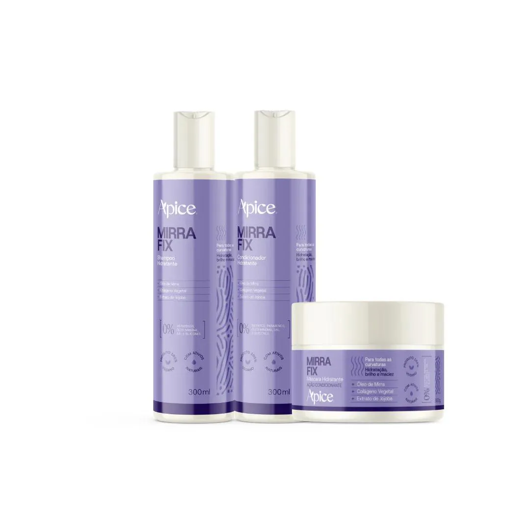 Kit Linha Mirra Fix contém: shampoo Hidratante 300ml, condicionador Hidrante 300 ml e máscara Hidratante 300g