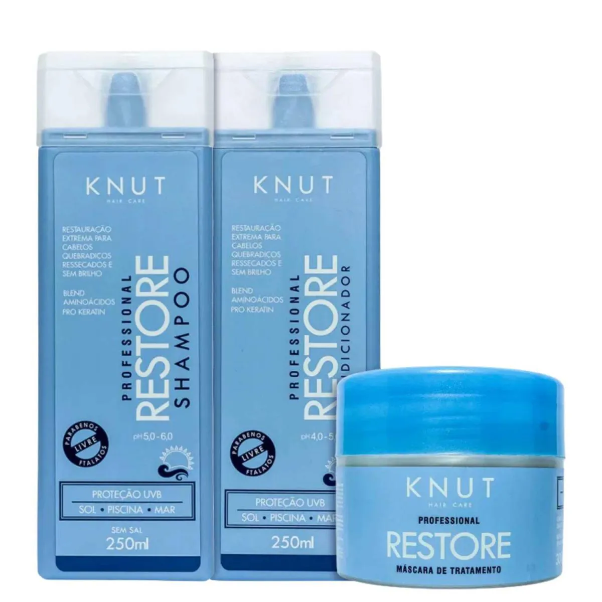 O Kit Knut Restore Tratamento restaura imediatamente os fios e melhora o aspecto do cabelo danificado. Kit Knut Restore Tratamento protege do sol, mar e piscina contra os raios UVA/UVB e protege de danos diversos.