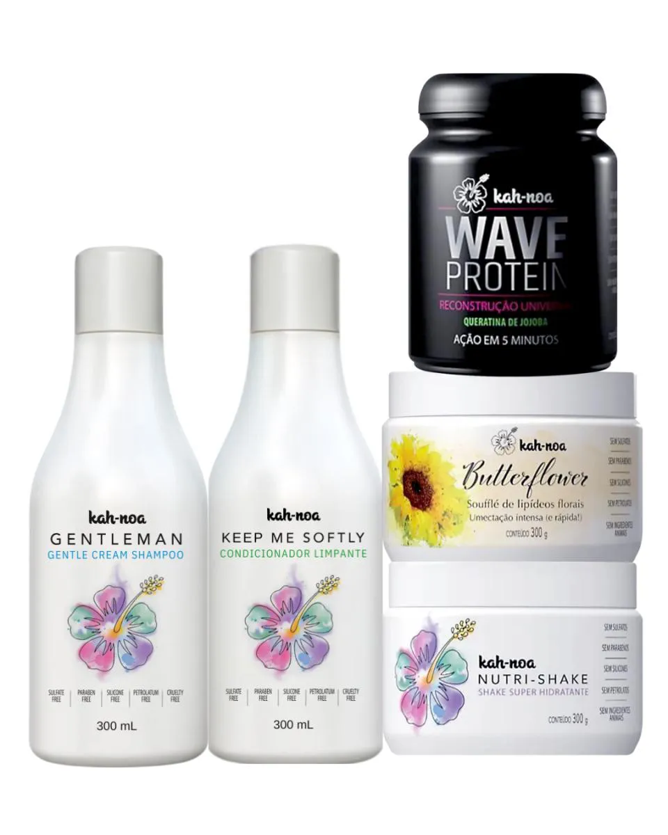 Este kit contém: 01 shampoo Creme Sem Sulfato Gentleman 300g Kah-Noa 01 condicionador Co Wash 300g Kah-Noa 01 máscara de Hidratação Nutri-shake 300g Kah-Noa 01 Soufflé de Lipídeos Butterflower 300g Kah-Noa 01 Máscara de Reconstrução Wave Protein 300g Kah-Noa Tipo de cabelo: Ondulado, Crespo, Tingidos ou Quimicamente Tratados, cacheado, Naturais.