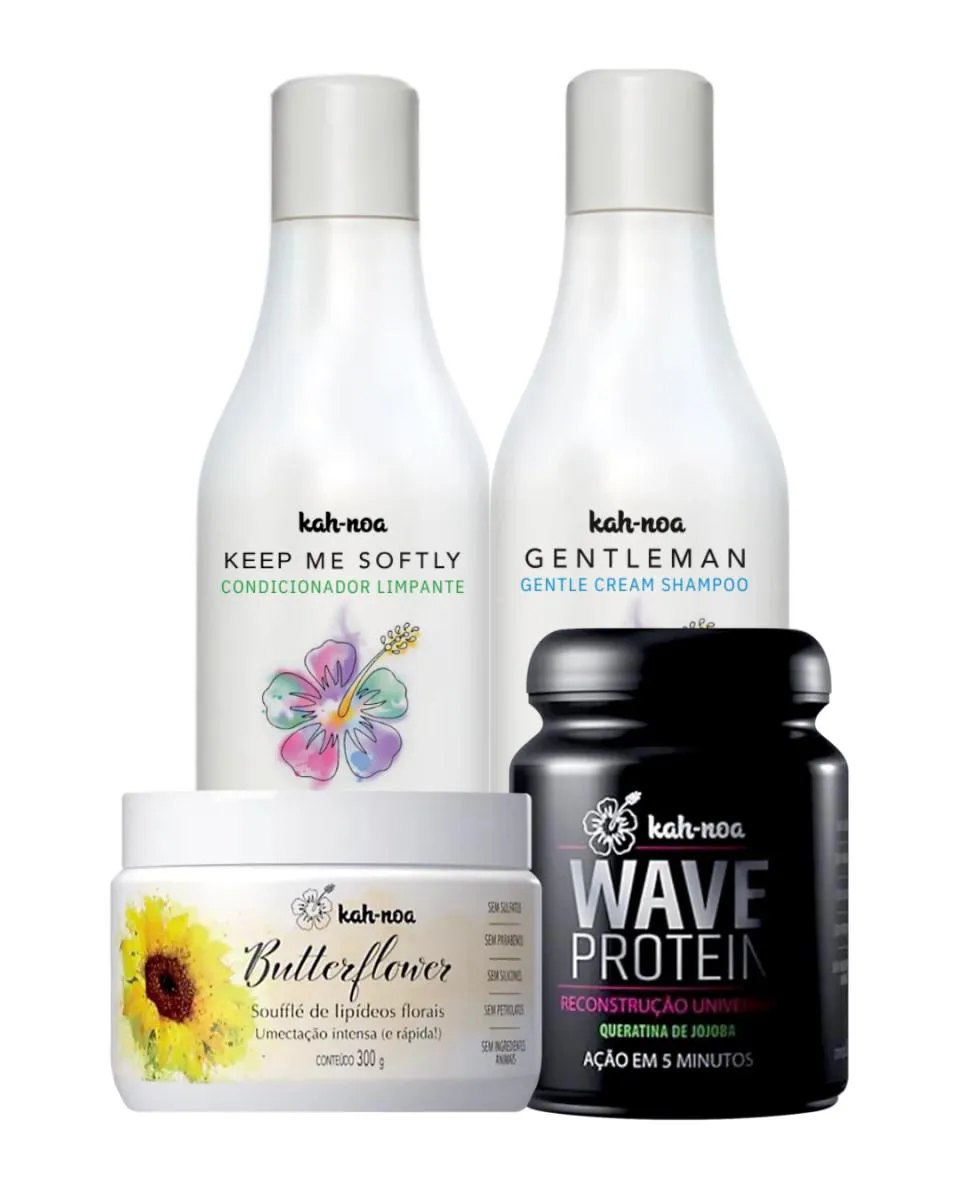 Kit shampoo, condicionador, Butterflower e Wave Protein Kah-Noa 01 Shampoo Gentleman 300g (Shampoo sem sulfato, que limpa sem agredir os fios) 01 Condicionador Keep me Softly 300g (Blend super nutritivo e condicionante) 01 máscara Umectante Butterflower 300g (Umectação Sem Trabalho, é só aplicar!) 01 Máscara Reconstrutora Wave Protein 300g (Reconstrução hidratante, ativa em 5 minutos!) Para cabelos cacheados, crespos, ondulados e em transição!
