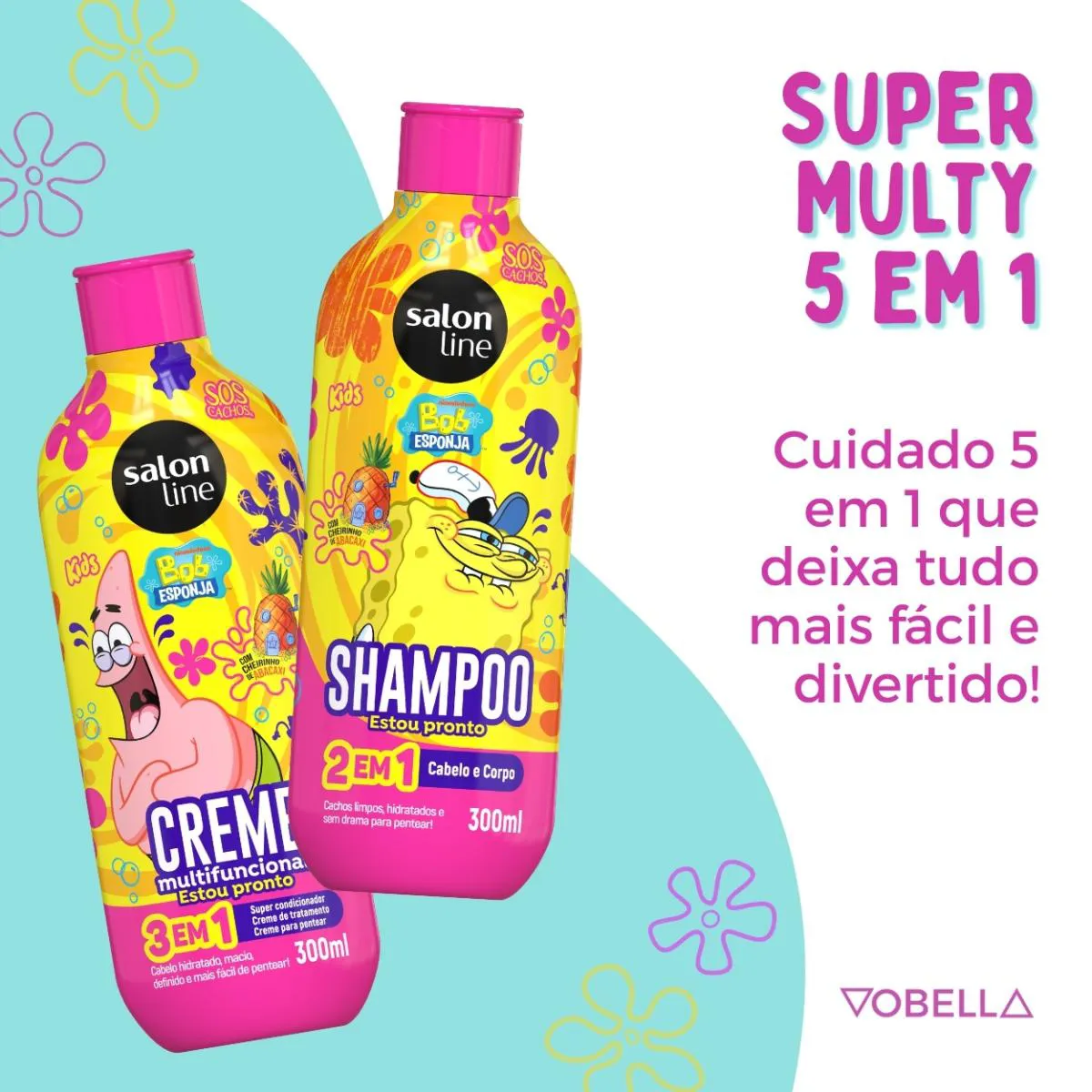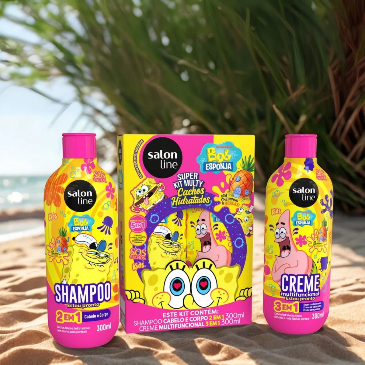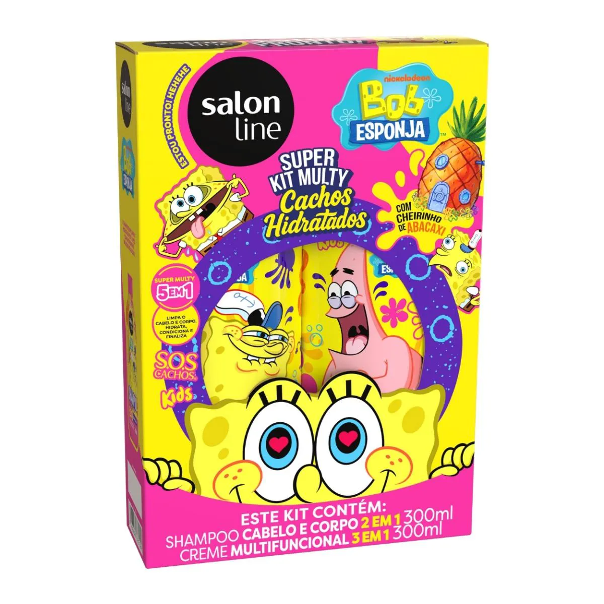 O Kit Shampoo Condicionador Multy SOS Kids Bob Esponja é um conjunto de produtos de higiene infantil composto por um shampoo 2 em 1 e um creme multifuncional 3 em 1, desenvolvido especialmente para o cuidado capilar de crianças.