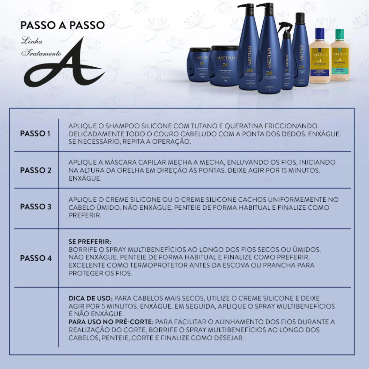 - Aneethun Linha A Creme de Silicone é ideal para utilizar semanalmente ou quando o cabelo estiver seco e com pontas duplas.