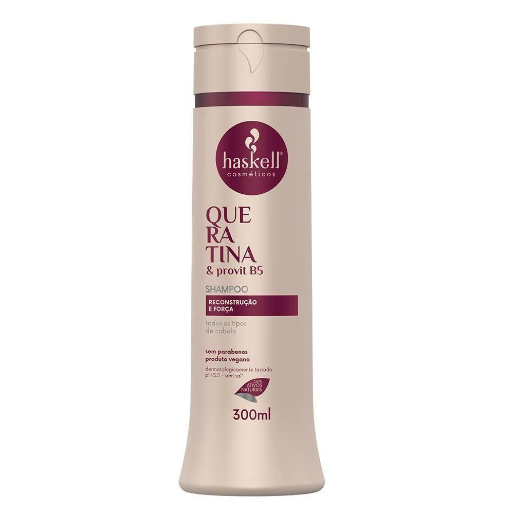O kit é um conjunto de produtos capilares da linha Queratina & Provit B5 da marca Haskell, composto por shampoo, condicionador e máscara de tratamento, desenvolvido para reconstruir e restaurar a saúde dos cabelos.
