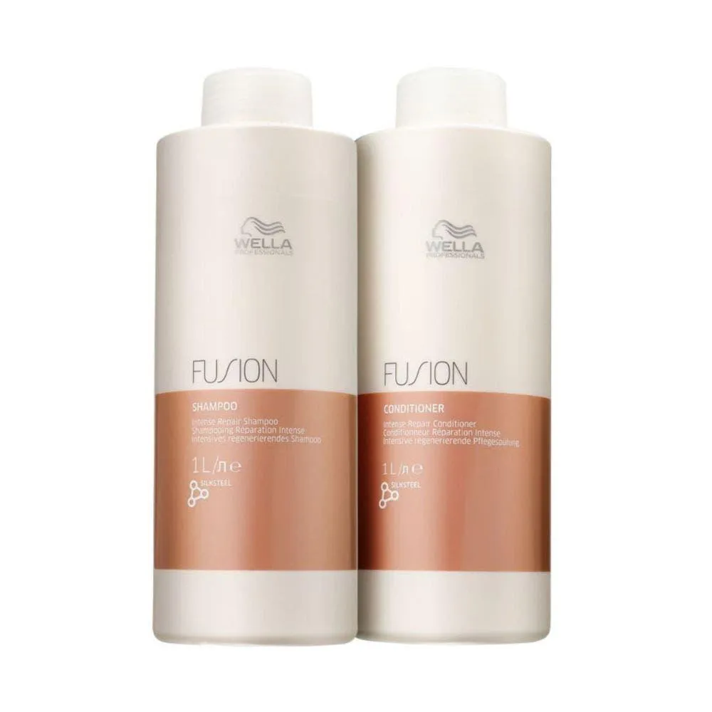 Kit em tamanho salão desenvolvido para cabelos danificados, composto por shampoo e condicionador da linha Wella Professionals Fusion.