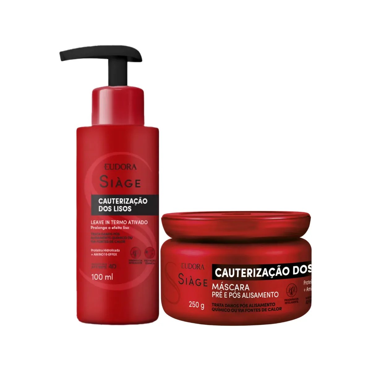 O Kit Siàge Cauterização dos Lisos Leave In Capilar + Máscara Capilar Cabelo Liso é um conjunto de produtos desenvolvidos especificamente para cabelos alisados. O leave-in capilar Siàge Cauterização dos Lisos é um produto Termo-Ativado que age profundamente nos fios, garantindo cauterização e selagem imediata. Já a máscara capilar Siàge Cauterização dos Lisos é um tratamento intensivo para recuperar, selar e nutrir a fibra capilar desde o córtex, atuando especificamente em fios que passaram por processos químicos de alisamento.
