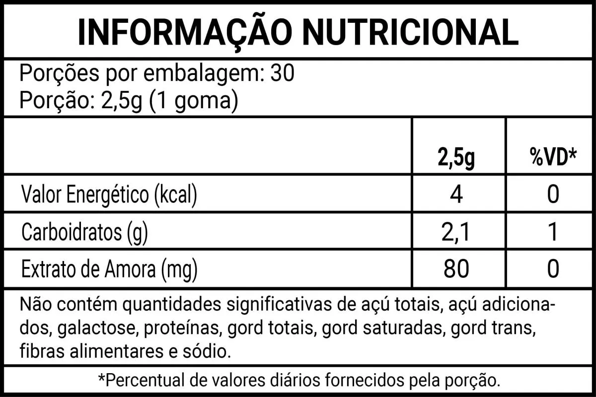 Sugere-se a ingestão de 1 goma ao dia. Este produto é recomendado para o grupo populacional a partir de 19 anos. Este produto não é um medicamento. Não exceder a recomendação diária de consumo indicada na embalagem. Mantenha fora do alcance de crianças.Ingredientes