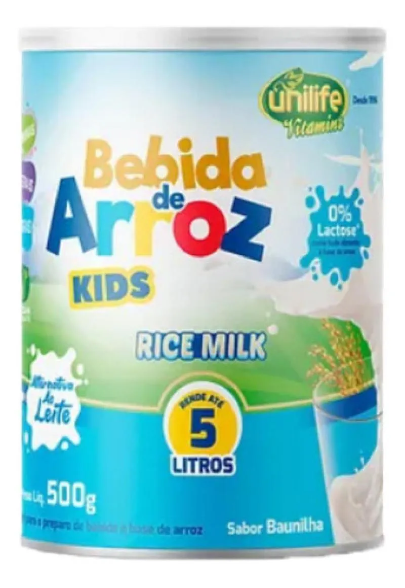 Bebida de Arroz Kids Rice Milk Sem Lactose 500g - Unilife é um suplemento alimentar desenvolvido para crianças, fornecendo uma alternativa saudável e nutritiva ao leite tradicional. Este produto é feito à base de arroz e enriquecido com vitaminas e