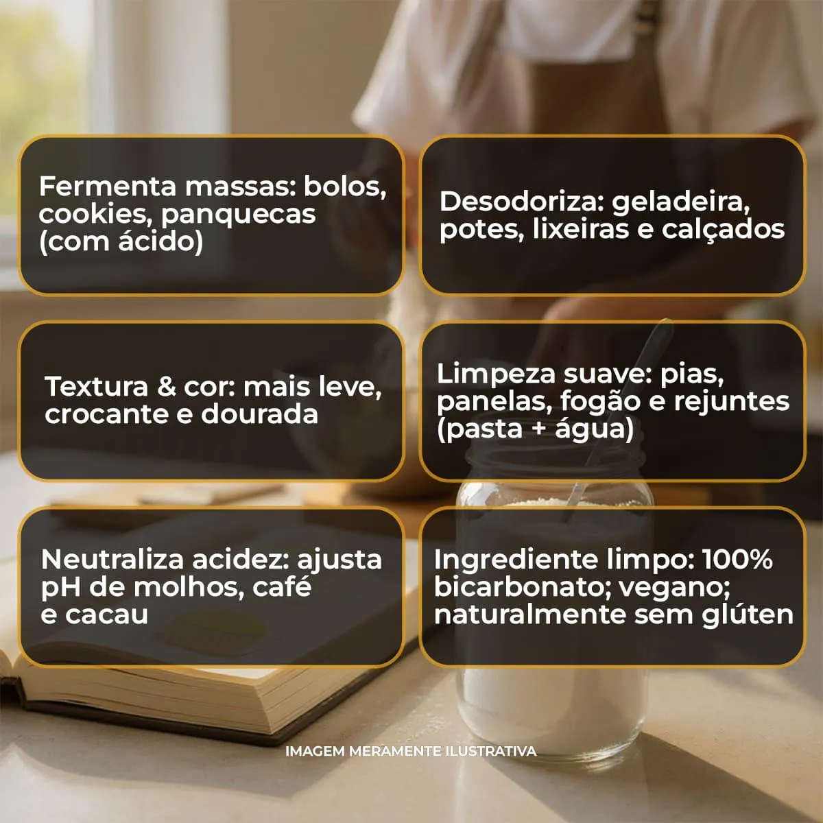 - Em uso alimentar: usar pequenas quantidades por exemplo, ½ colher de chá ou a medida específica para receitas que pedem “bicarbonato”.
