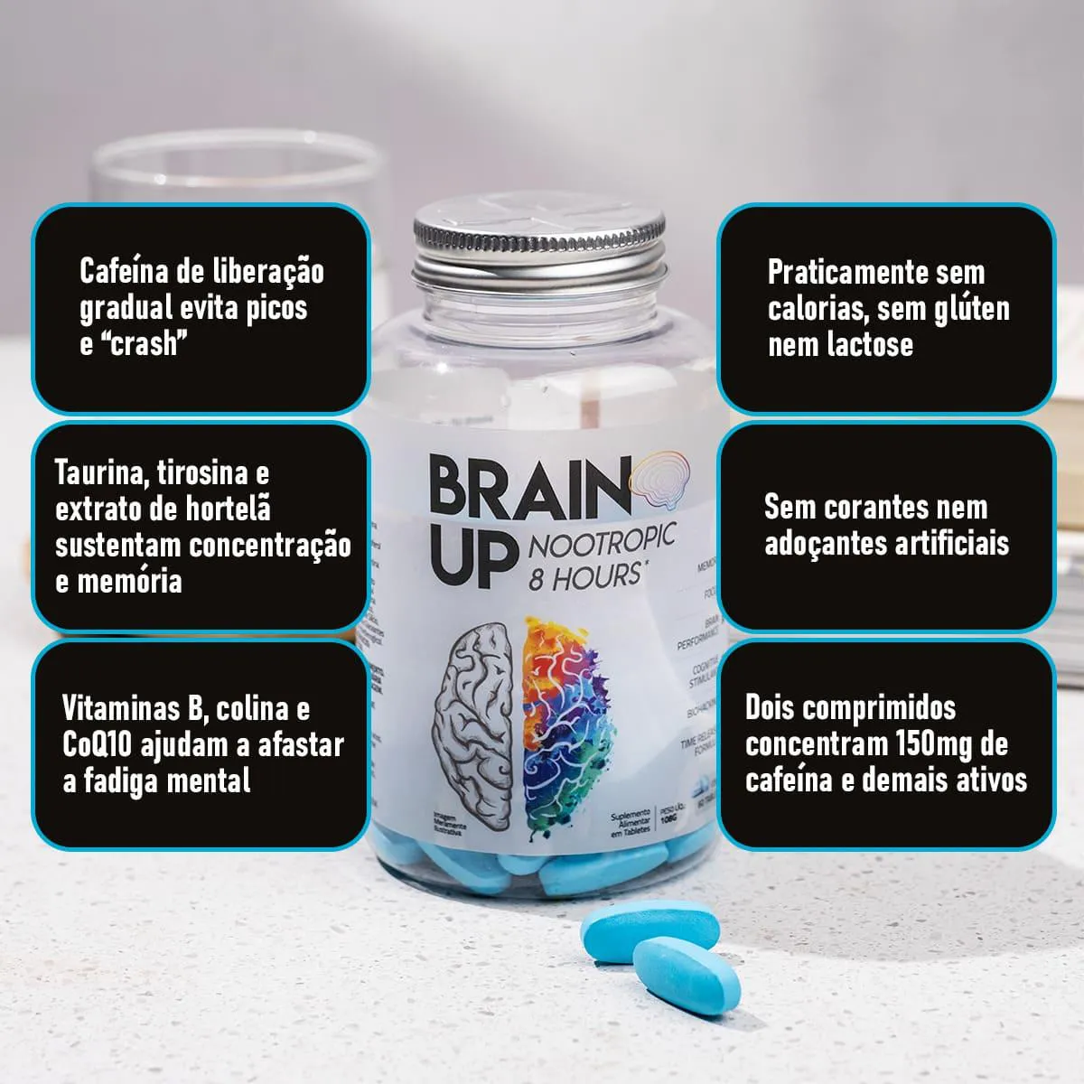 O Brain Up 60 Tabletes da True Source é um nootrópico desenvolvido por médicos e nutricionistas com foco em otimização cognitiva e desempenho cerebral. Ele reúne um blend poderoso de ingredientes neuroativadores, entre eles: cafeína nanoencapsulada com liberação gradual de até 8 h, coenzima Q10, taurina, L‑tirosina, fosfatidilserina (Neuroserine), vitaminas B6, B12, E, astaxantina e spirulina azul. A fórmula é livre de glúten, lactose, adoçantes e corantes artificiais.Para que serve?