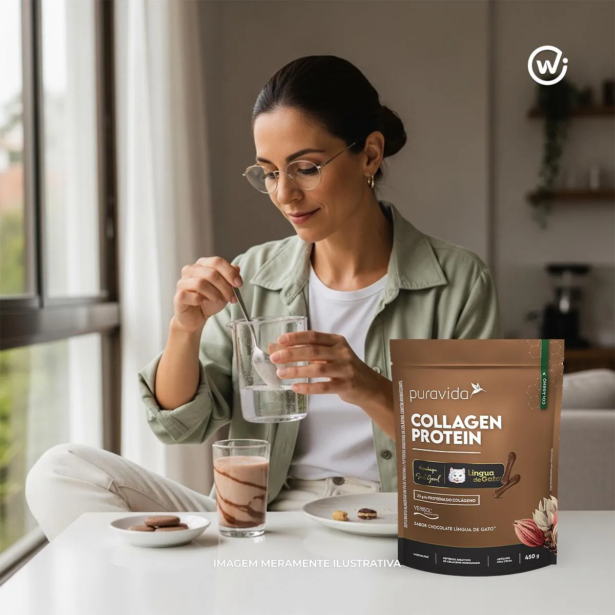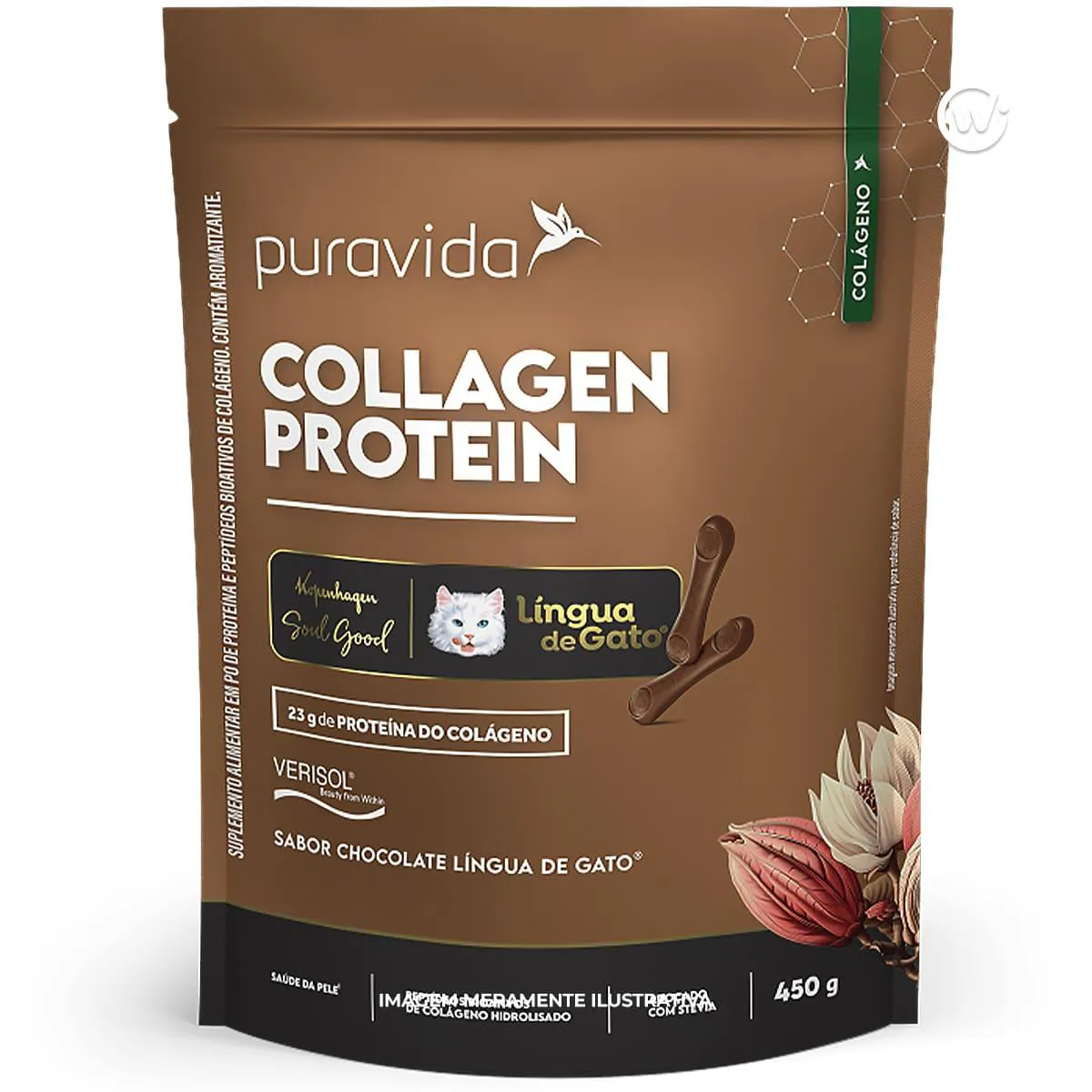 O Collagen Protein Língua de Gato 450g da Puravida é um suplemento em pó que combina proteína de colágeno com o sabor tradicional de chocolate “Língua de Gato” da Kopenhagen. Cada porção oferece 23g de proteína e contém também 2,5g de peptídeos bioativos de colágeno hidrolisado (Verisol).A fórmula é adoçada com stevia, não contém lactose e não tem adição de açúcar.
