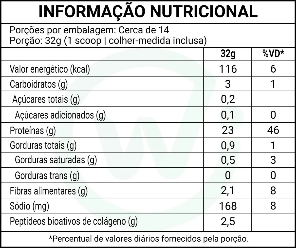 Contém 2,5g de desse tipo de colágeno por porção, indicado para manutenção da saúde da pele.