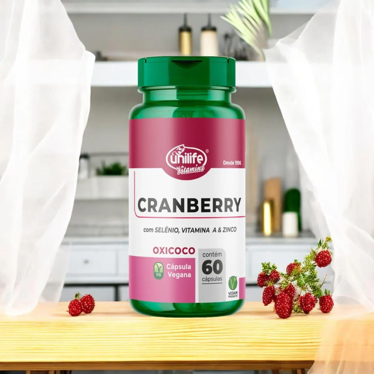 Cranberry 60 Cápsulas Unilife é um suplemento alimentar formulado para promover a saúde do trato urinário e proporcionar benefícios antioxidantes. Este produto combina os benefícios naturais do cranberry com zinco bisglicinato, acetato de retinol (
