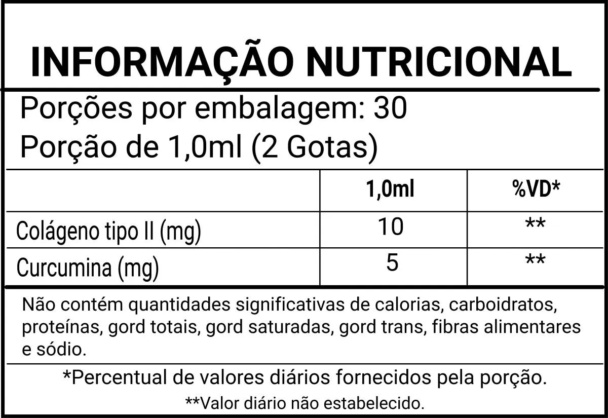 Extrato de rizomas de cúrcuma longa e colágeno tipo II. Veículo: água potável, glicerina, aroma natural de gengibre e aroma idêntico ao natural de abacaxi, estabilizante carboximetilcelulose, edulcorante glicosídeo de steviol e conservador de potássio. Ao escolher a Cúrcuma com Colágeno Tipo 2 em Gotas 30ml Qualylife, você está optando por um suplemento que combina saúde, bem-estar e praticidade em um só frasco. Seja para melhorar a saúde das articulações, combater a inflamação ou promover o bem-estar geral, este suplemento é uma excelente adição à sua rotina diária. A Cúrcuma com Colágeno Tipo 2 em Gotas 30ml Qualylife destaca-se no mercado por sua pureza e qualidade, sendo um aliado indispensável para quem busca uma vida mais saudável e equilibrada. A embalagem prática com 30ml garante que você tenha sempre à mão este suplemento versátil e benéfico para diversas aplicações diárias.