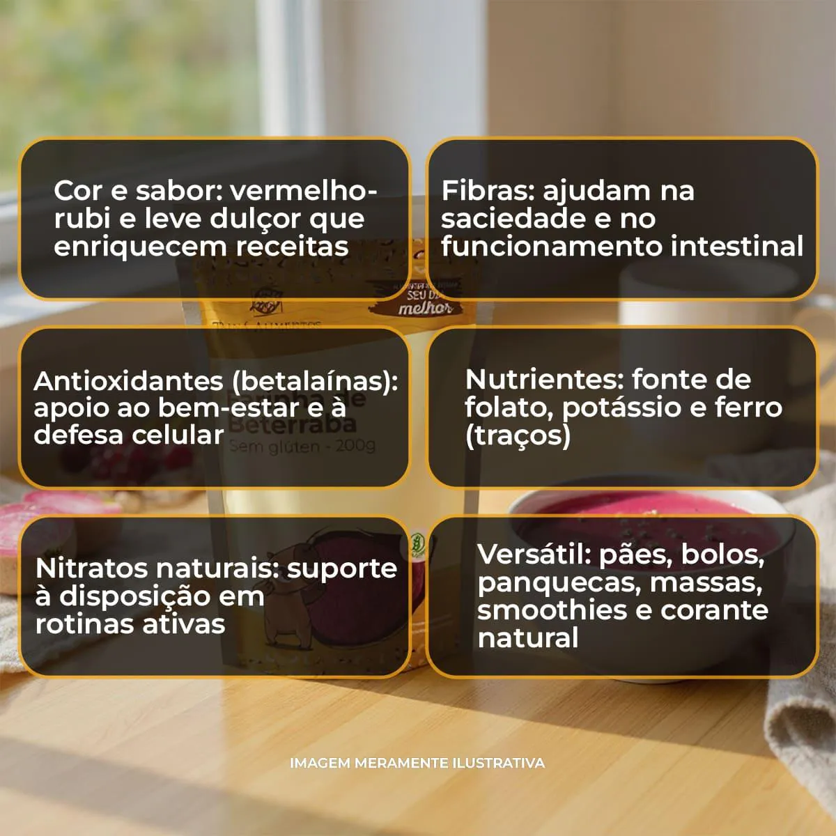 A Farinha de Beterraba 200g da Tainá Alimentos é um pó obtido a partir da beterraba desidratada e moída. O produto é vegano, sem glúten e sem contaminação cruzada com lactose ou leite, oferecendo uma alternativa saudável às farinhas convencionais. Ela preserva boa parte dos nutrientes da beterraba, como fibras, compostos antioxidantes, vitaminas e minerais.Para que serve?