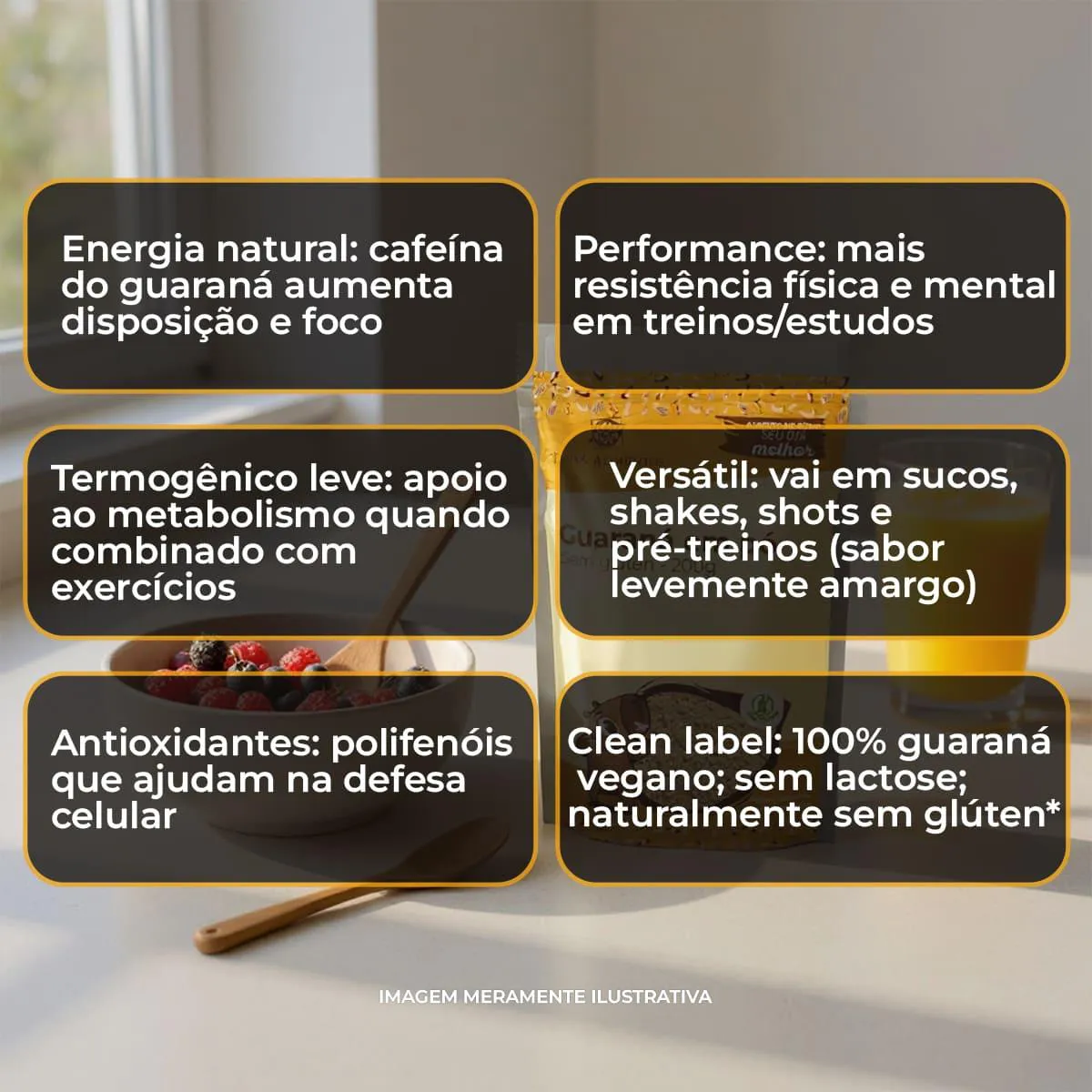 A cafeína e outros compostos bioativos ajudam a acelerar o metabolismo, contribuindo para gasto calórico e disposição.Sugestão de uso