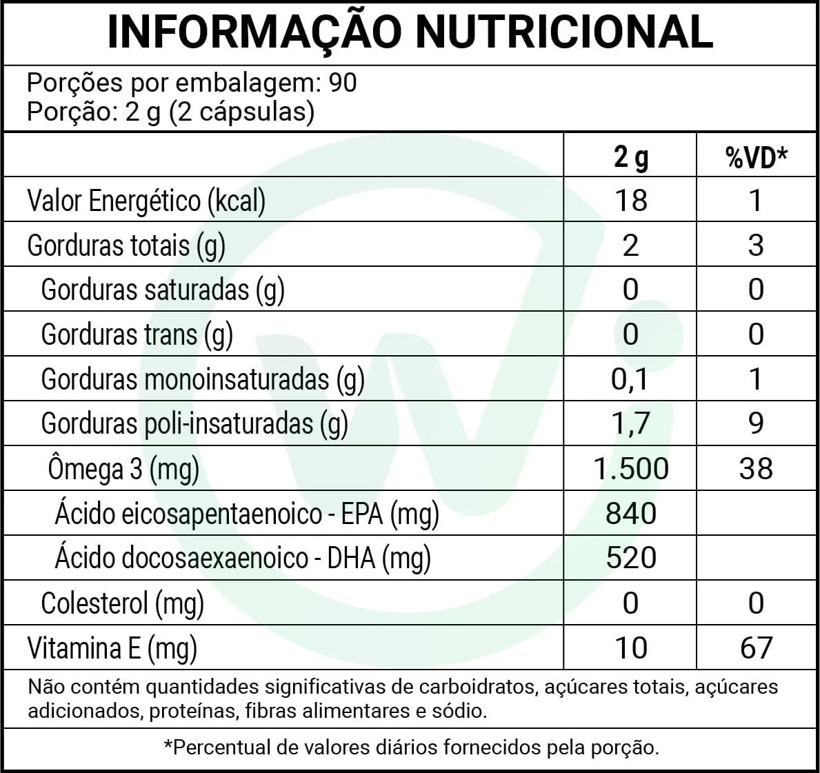 - Principais ingredientes: Óleo de peixe (fonte de EPA e DHA) e DL-alfa tocoferol (vitamina E).
