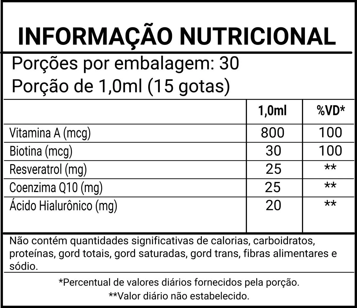 Formulado com resveratrol sintético, coenzima Q10, colágeno hidrolisado, hialuronato de sódio, vitamina A e biotina, garantindo a máxima eficácia na suplementação.