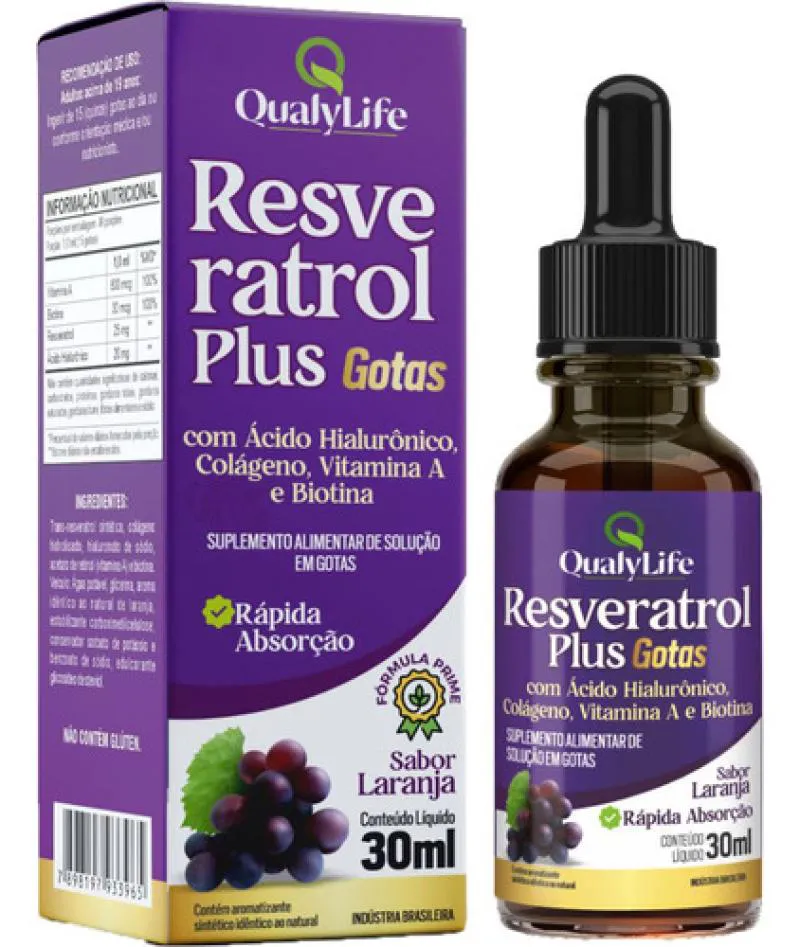 Resveratrol Plus Gotas Sabor Laranja 30ml Qualylife é um suplemento alimentar em formato líquido que combina os benefícios do resveratrol com a coenzima Q10,