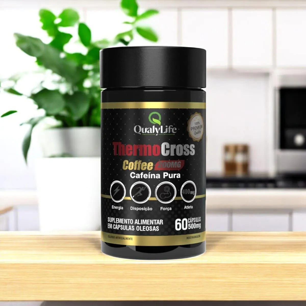 Óleo de soja, cafeína, água purificada, gelificante gelatina, umectante glicerol, emulsificante lecitina, estabilizante cera de abelha e corantes dióxido de titânio, ponceau 4R, vermelho allura, amarelo crepúsculo e azul brilhante.Contém glúten. O Thermo Cross 60 Cápsulas - QualyLife é uma opção prática para quem busca potencializar o metabolismo e aumentar a energia diária, contribuindo para a melhoria do desempenho físico e auxiliar na gestão de peso. O Thermo Cross Coffee 750 mg da QualyLife é um suplemento alimentar que combina óleo de soja e cafeína, auxiliando no aumento da disposição e energia. Recomenda-se a ingestão de 1 cápsula ao dia para adultos acima de 19 anos. Para atletas, a orientação é de 1 cápsula duas vezes ao dia, uma hora antes do exercício físico. O produto contém glúten. Ao incorporar o Thermo Cross Coffee da QualyLife em sua rotina, você pode potencializar seus treinos e atividades diárias com mais energia e disposição. A embalagem contém 60 cápsulas de 750 mg cada, proporcionando praticidade para o uso diário.