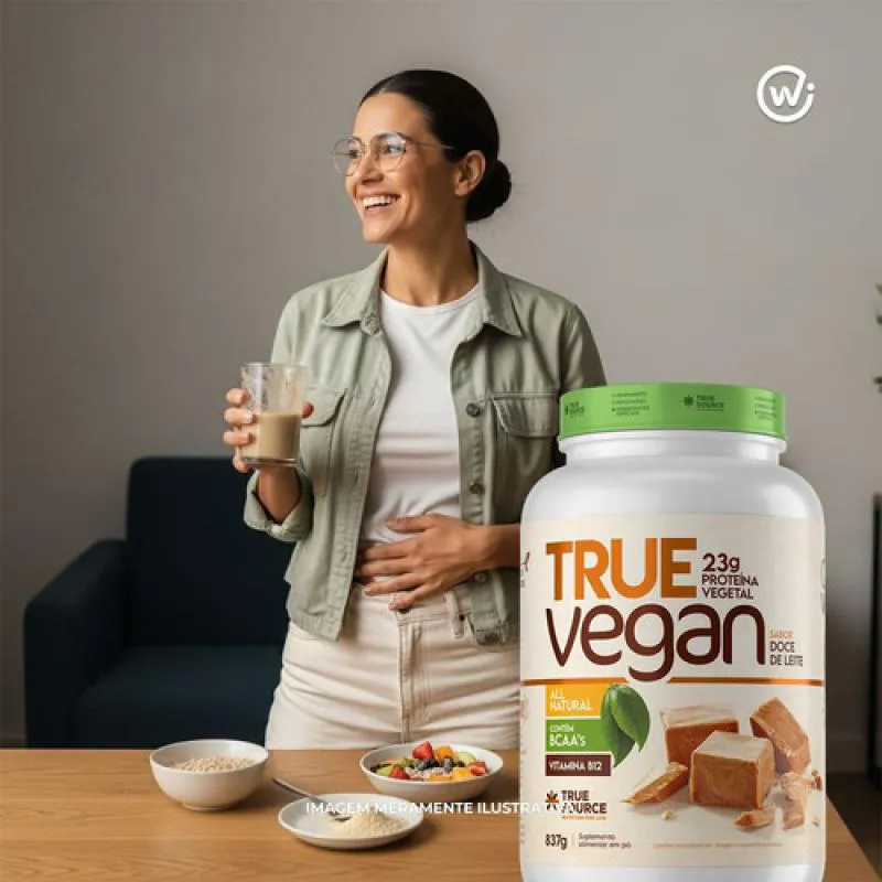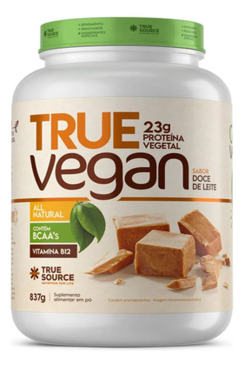 O True Whey Vegan Doce de Leite 837g (também chamado True Vegan Doce de Leite) é uma proteína vegetal formulada pela True Source. Embora o nome contenha “Whey Vegan”, trata-se de um blend de proteínas vegetais (ervilha + arroz integral), enriquecido com insumos adicionais como chia, amêndoa de castanha de caju, TCM (triglicerídeos de cadeia média) e vitamina B12 (cianocobalamina). É adoçado com edulcorantes naturais (estévia, taumatina) e não contém glúten nem corantes artificiais.O rótulo afirma que o produto entrega 100% da necessidade diária de vitamina B12, e que seu aminograma é semelhante ao do whey convencional, com bom aporte de BCAAs.