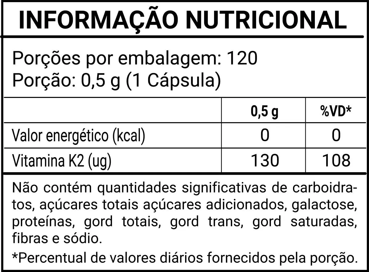 Amido modificado e menaquinona- MK-7. Cápsula: gelatina vegetariana e água. A Vitamina K2 Menaquinona-7 120 Cápsulas - Unilife é um suplemento que auxilia na coagulação normal do sangue e na manutenção dos ossos. Cada cápsula contém 130 mcg de vitamina K2 na forma de menaquinona-7, uma forma altamente biodisponível. Ideal para quem busca fortalecer a saúde óssea e cardiovascular. Ao escolher a Vitamina K2 Menaquinona-7 - Unilife, você opta por um produto de alta qualidade, livre de glúten e lactose, adequado para veganos. Com 120 cápsulas de , oferece suplementação prática e conveniente, contribuindo para o bem-estar de forma segura e confiável.