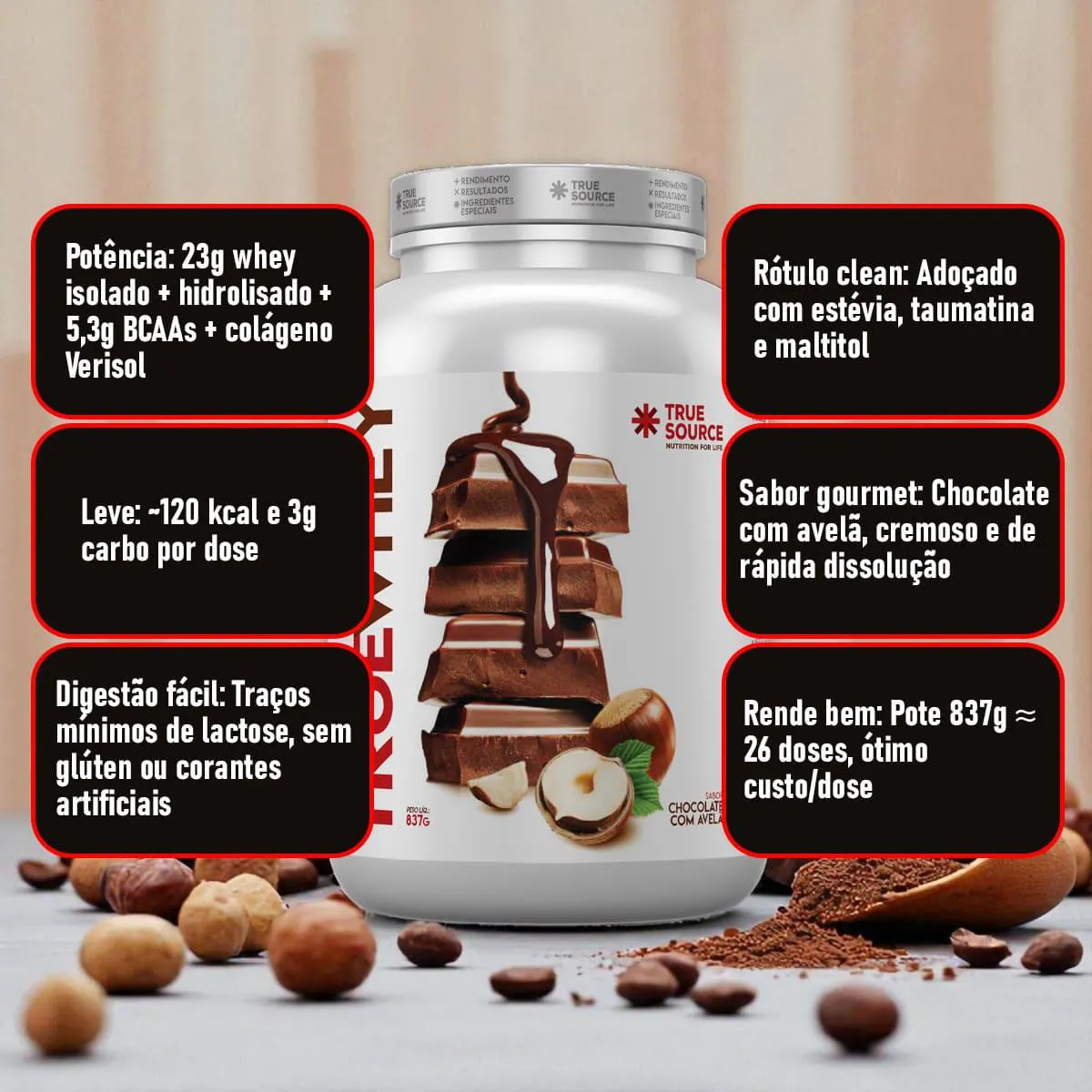 A fórmula ainda é enriquecida com triglicerídeos de cadeia média (TCM) e pedaços de castanha de caju, promovendo saciedade, energia rápida e um sabor gourmet irresistível. Adoçado naturalmente com estévia, taumatina e maltitol, é livre de glúten e corantes artificiais Ao incorporar o Whey Chocolate com Avelã da True Source em sua rotina diária, você oferece ao corpo um suporte completo para ganho de massa muscular, recuperação eficiente, controle do apetite e cuidados com a saúde da pele. Com aproximadamente 26 porções por embalagem, é ideal para quem busca praticidade, sabor sofisticado e qualidade nutricional.