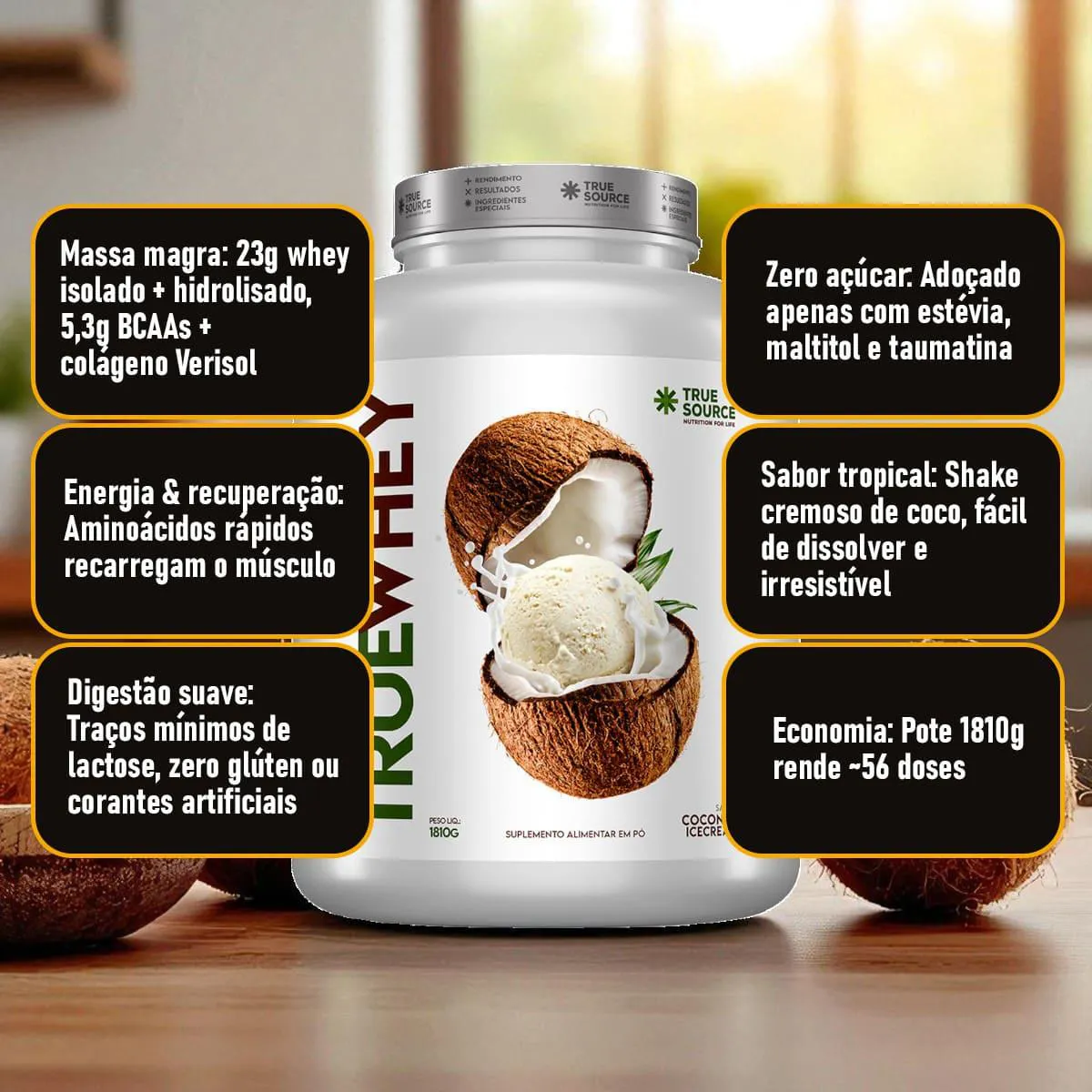 True whey protein Coconut Ice Cream 1 810 g True Source: Benefícios, Usos e Indicações