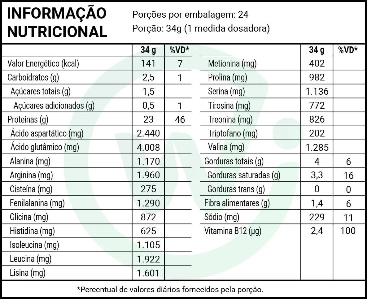 - 23 g de proteína por porção (34 g), equivalente à proteína de origem animal