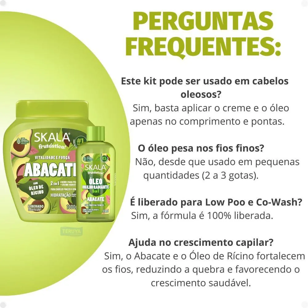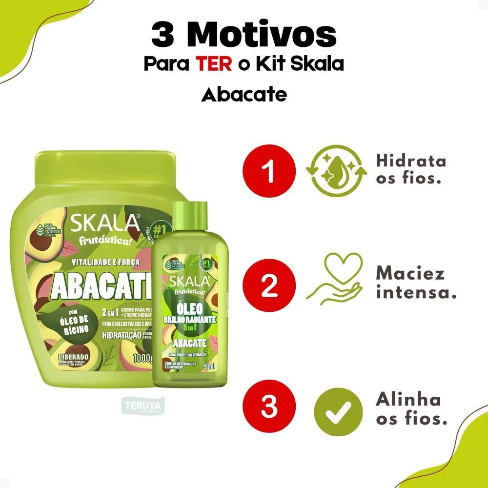 Transforme seus cabelos com o Kit Skala Frutastica Abacate, a solução completa para revitalizar seus fios! Este poderoso kit da SKALA combina vitaminas e ciência capilar, oferecendo frescor, vitalidade e nutrientes essenciais. Diga adeus aos cabelos fracos e sem vida com o poder nutritivo do Abacate e a força do Óleo de Rícino, que juntos promovem um crescimento saudável, reduzem a queda por quebra, proporcionam maciez e hidratação profunda. Ideal para todos os tipos de cabelo, o Kit Skala Frutastica Abacate nutre, fortalece, combate a queda e o frizz, deixando seus cabelos radiantes e cheios de vida desde a primeira aplicação. Sinta a diferença e conquiste cabelos deslumbrantes!Benefícios Principais: