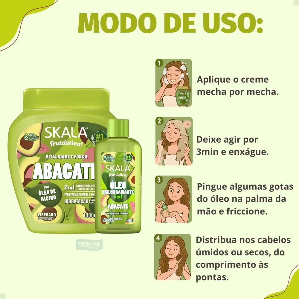 Creme de Tratamento Skala Frutastica Abacate 1000g:condicionador: Após lavar os cabelos, aplique o produto mecha por mecha, massageando suavemente por todo o comprimento. Enxágue abundantemente.Creme de Tratamento: Aplique no comprimento dos fios, evitando a raiz, e deixe agir por 3 minutos. Para um tratamento intensivo, utilize uma touca térmica/laminada por 15 minutos. Enxágue completamente.Pré-shampoo: Com os cabelos secos, divida-os em mechas e aplique o produto, enluvando os fios. Deixe agir por alguns minutos e enxágue antes de lavar com shampoo.Co-Wash: Com os cabelos completamente molhados, aplique uma pequena quantidade do produto no couro cabeludo e massageie suavemente. Enxágue e aplique mais produto no comprimento e pontas, desembaraçando os fios. Enxágue novamente. Repita a operação se necessário.Finalize com o Óleo Capilar Skala Frutástica Abacate 90ml, aplicando uma pequena quantidade nas pontas para brilho e proteção.Para resultados ainda melhores, utilize a linha completa Skala Frutástica Abacate.Anvisa Creme Tratamento: 25351.103542/2025-41